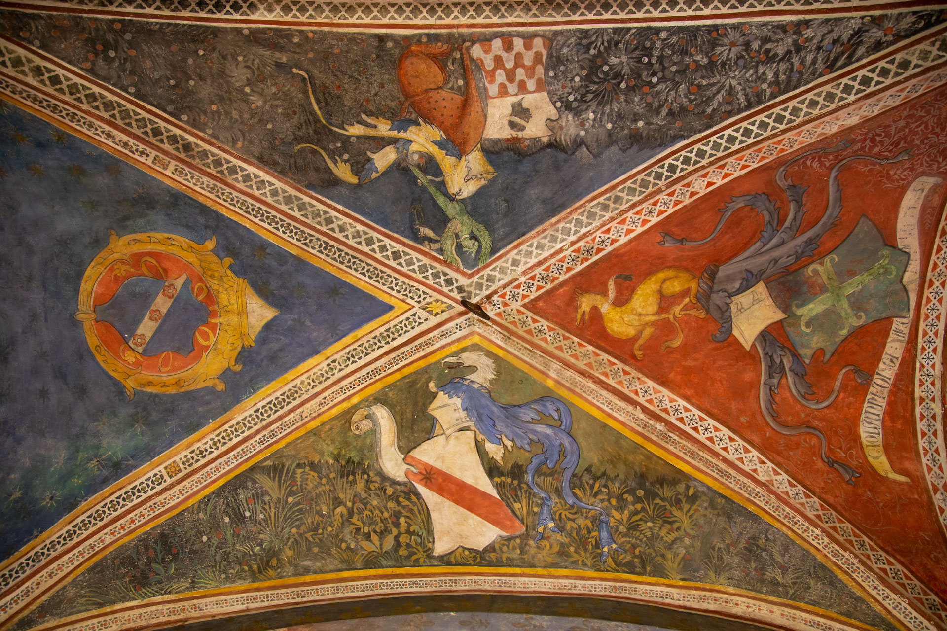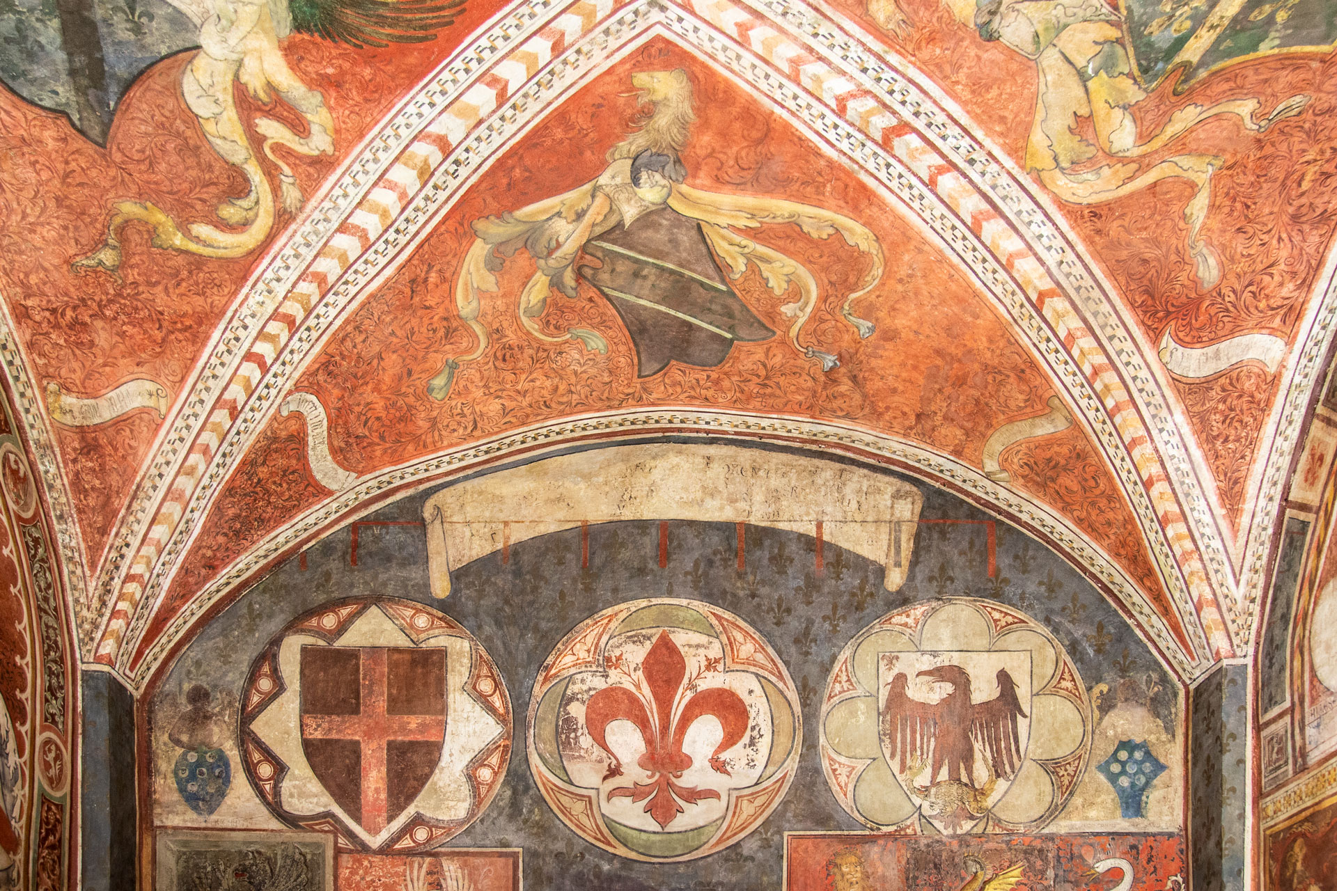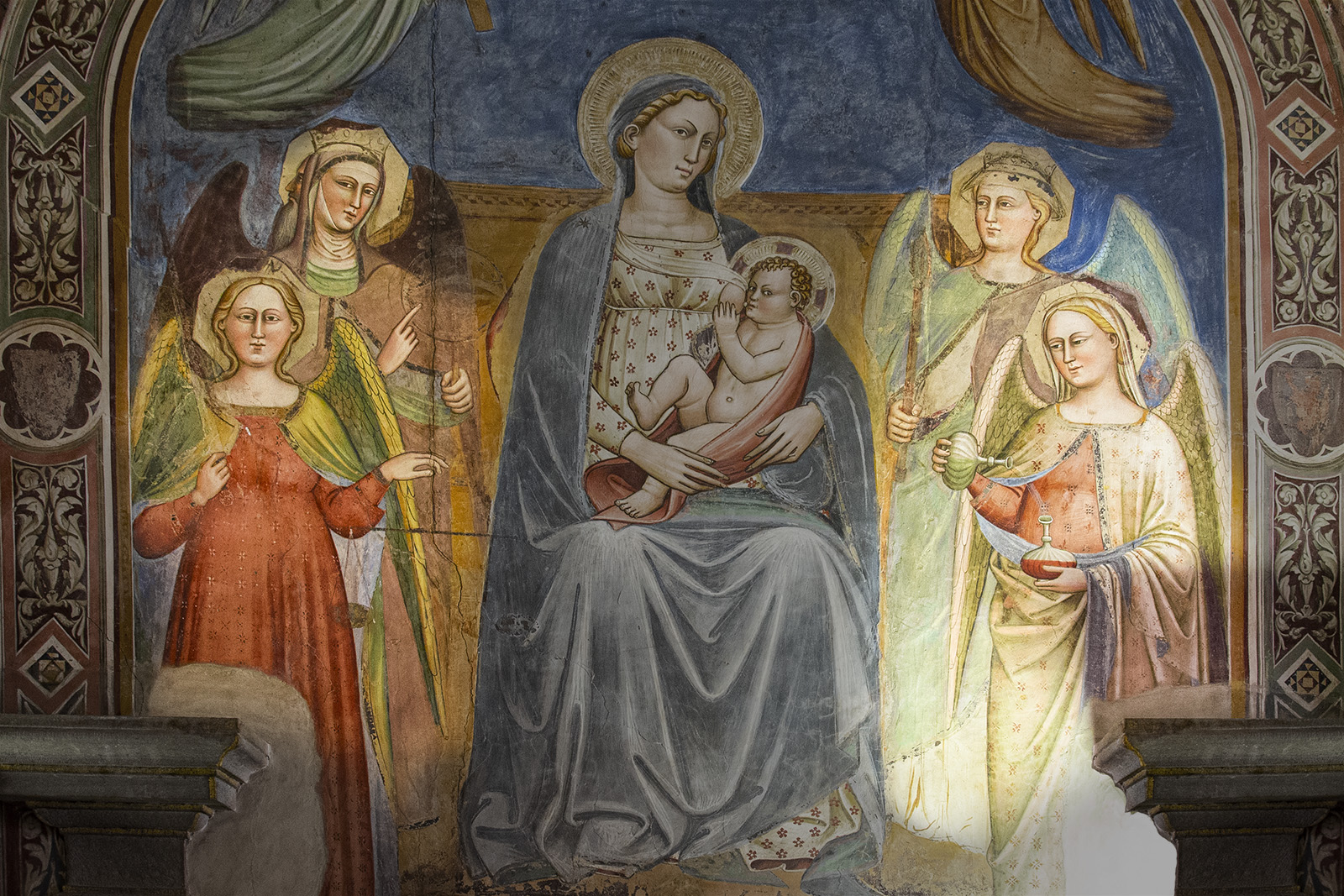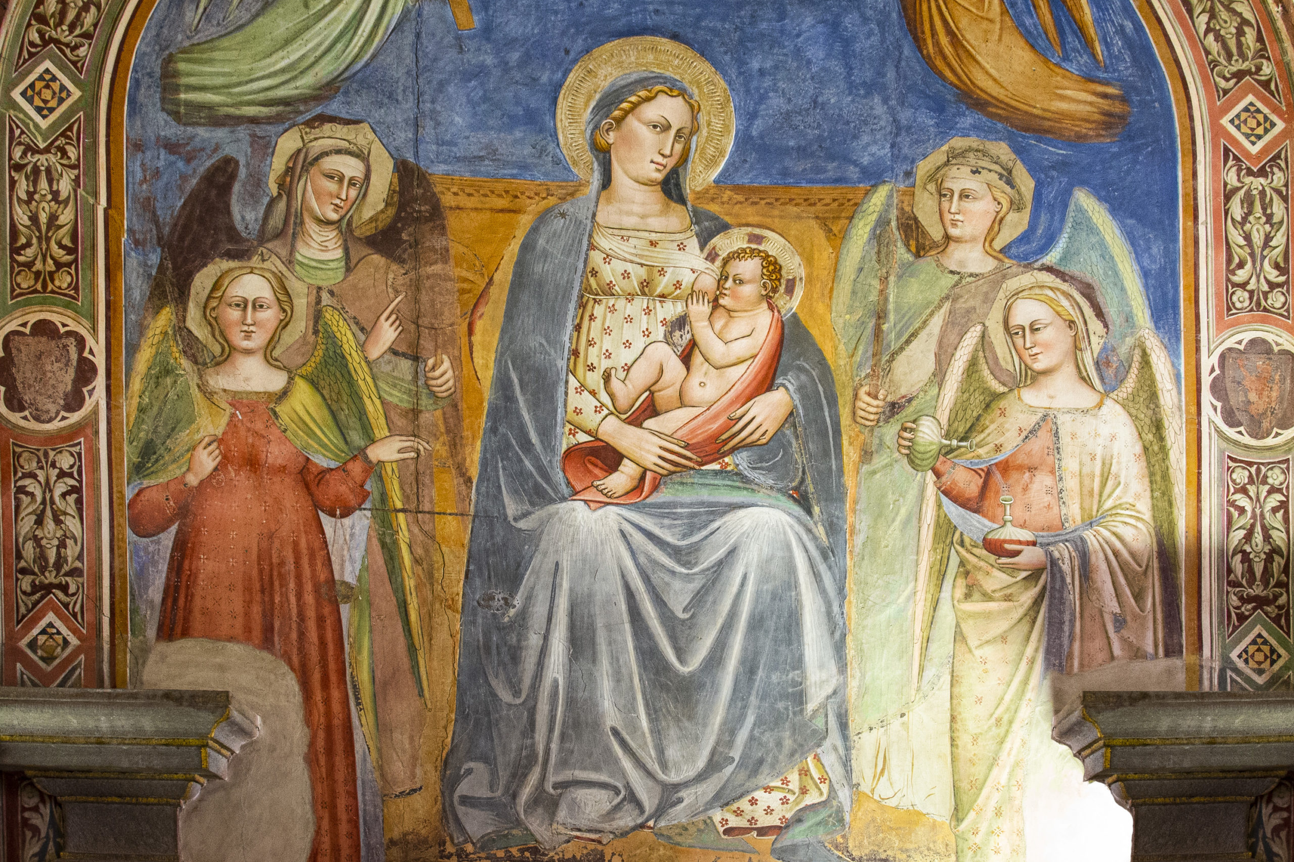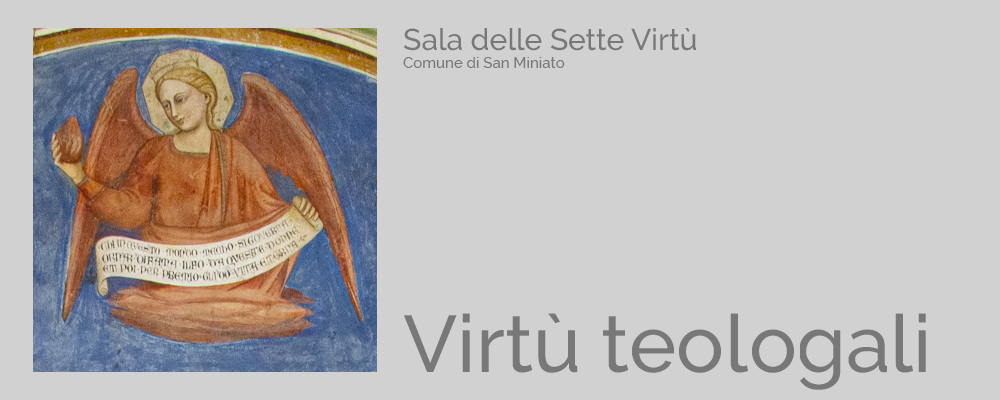 Siamo le virtù teologali, la fede, la carità la speranza. Ci vedi rappresentate nell’affresco attribuito a Cenni di Francesco, un allievo di Andrea Orcagna piuttosto attivo a San Miniato verso la fine del 1300. Siamo le tre figure in alto, con la croce, la fiamma e il volto santo. Abbiamo le ali perché siamo intelligenze angeliche. La nostra posizione all’interno della gerarchia celeste la puoi vedere bene se, all’interno del battistero del Duomo di Firenze, guardi in alto. Coppo di Marcovaldo, in un bellissimo mosaico, ci ha raffigurato nella seconda gerarchia angelica: meno potenti dei Cherubini e dei Serafini, più potenti degli angeli e degli arcangeli. Non esistevamo precisamente nella mente della gente prima che S. Paolo, nella prima lettera ai Corinzi, ci nominasse e ci definisse. Nel medioevo i nostri segni di riconoscimento variano un po’: un crocifisso come nel nostro caso per la Fede (altrimenti un fonte battesimale), la fiamma o un pane o un calice per la Carità, un ramoscello di olivo o, come nel nostro affresco, il volto santo per la Speranza. Anche i colori delle nostre vesti cambiano, di solito la Speranza veste di verde, la Fede di bianco, la Carità di rosso. Cenni di Francesco ci ha invece vestite di colori differenti, ma non è stato certo l’unico. Insieme alle nostre sorelle, raffigurate sotto di noi, accanto alla Madonna, abbiamo ispirato le azioni di buon governo del Vicario fiorentino Luigi Guicciardini che ci fece dipingere nel 1393.