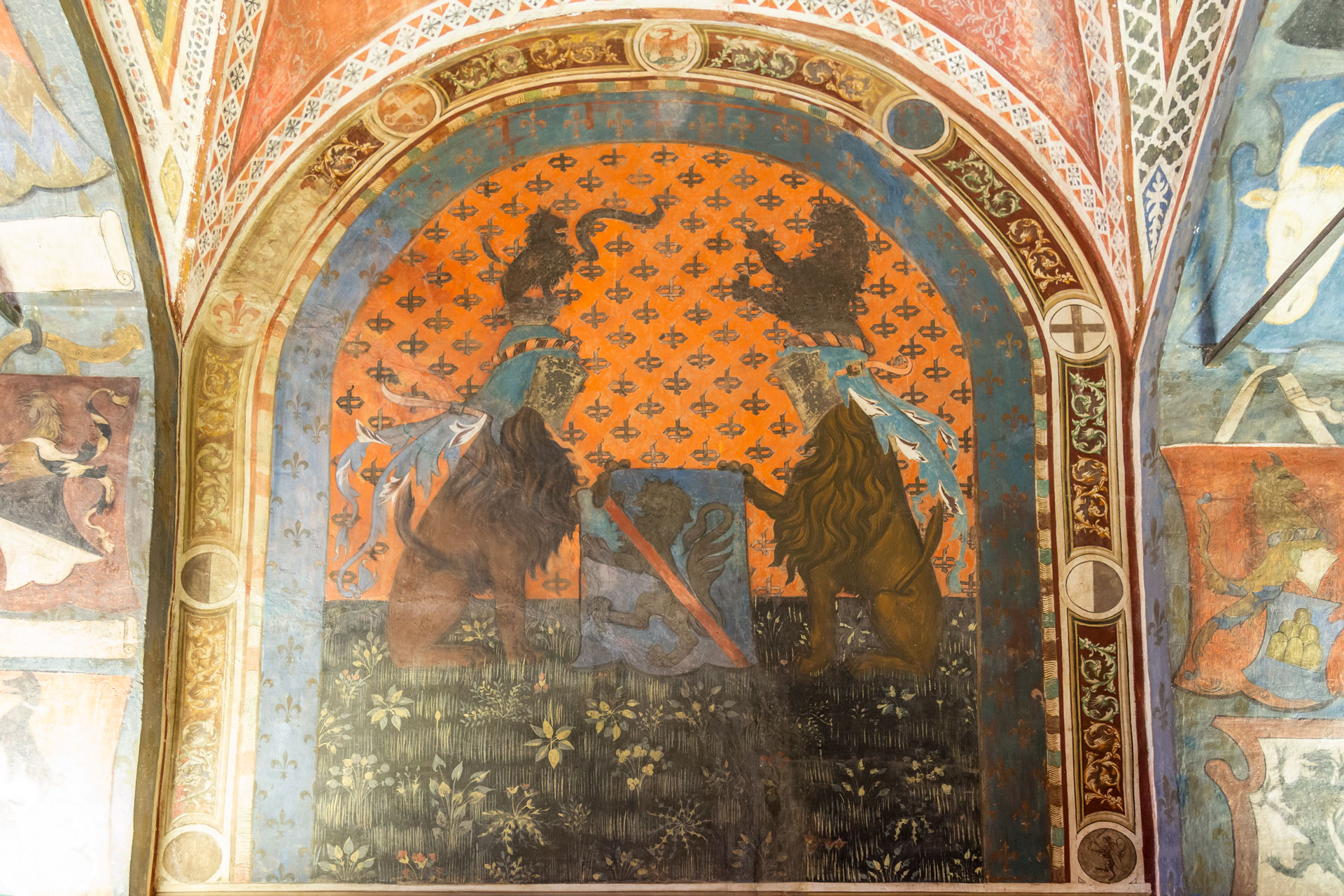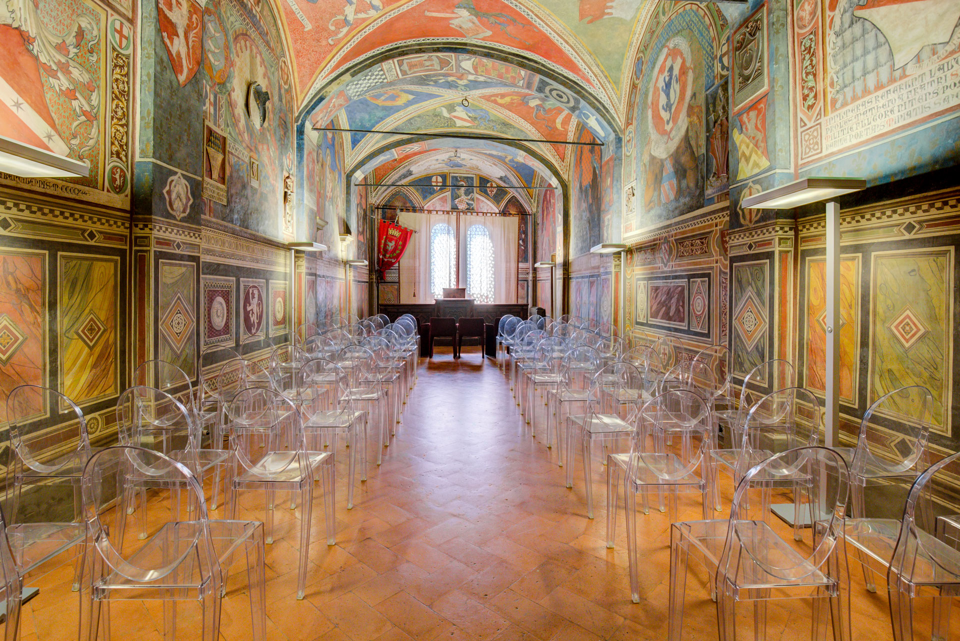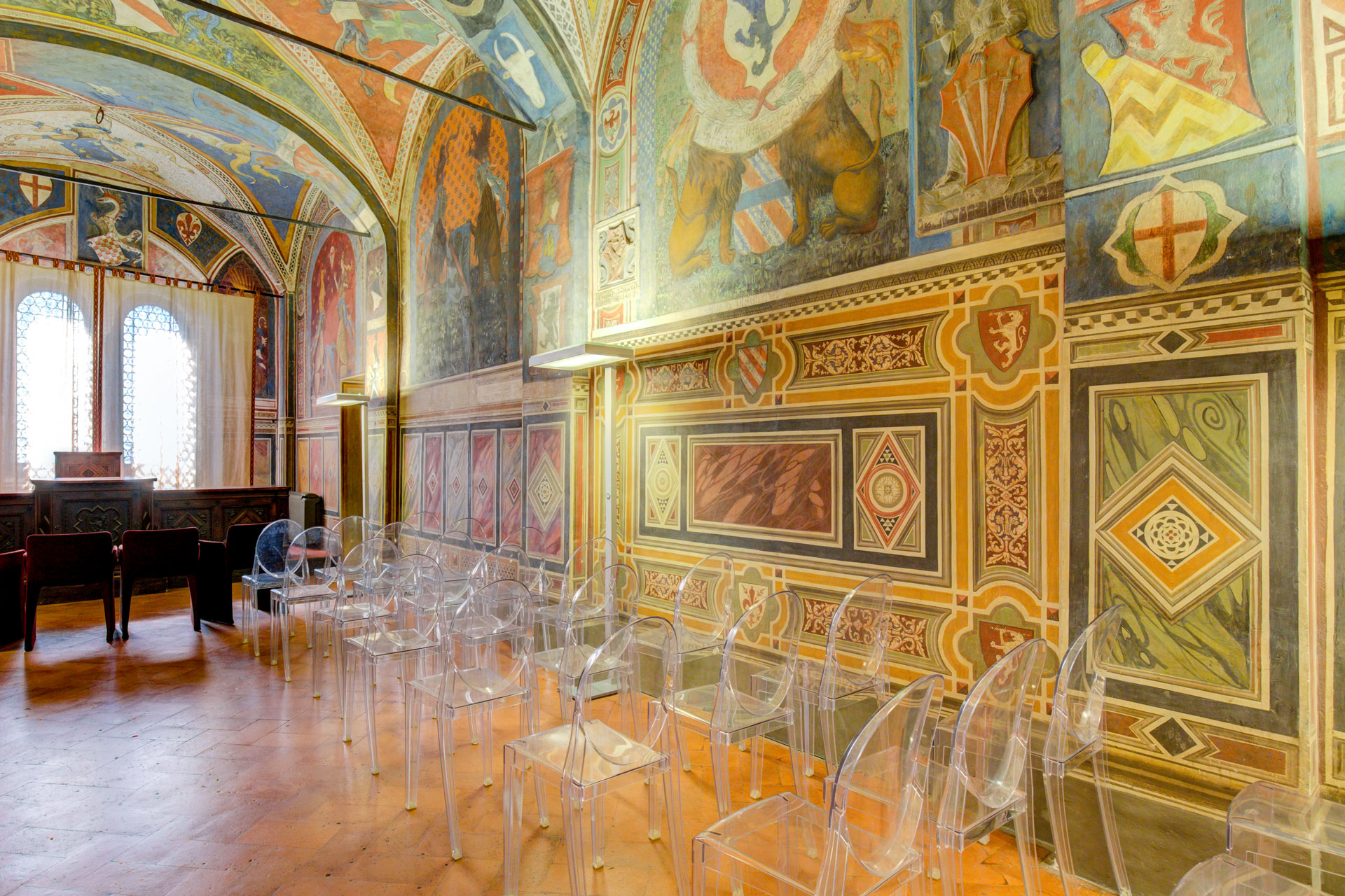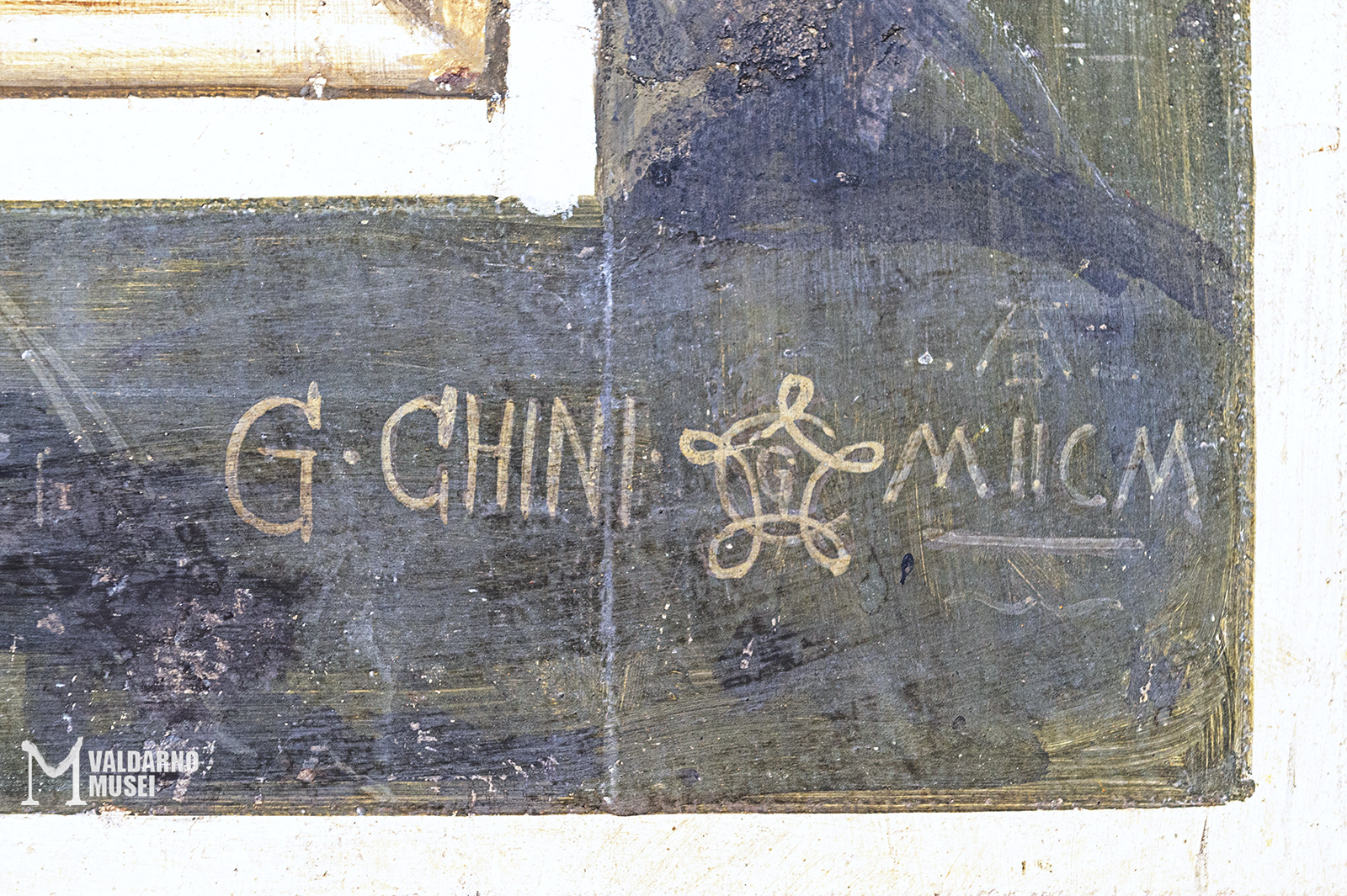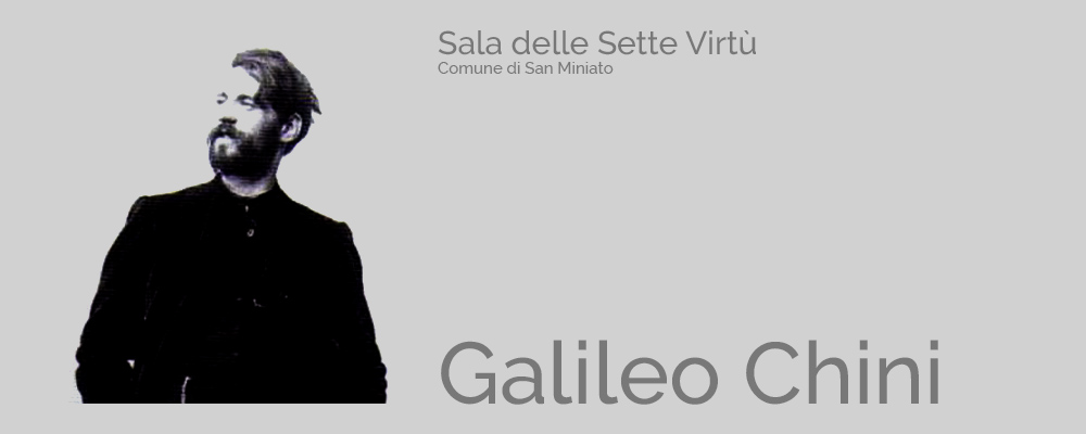 Sono Galileo Chini. Non mi vedi ma in questa sala c’è la mia firma; è in basso, a metà della parete sinistra. Come intuisci ero pittore ma ho lavorato bene anche la ceramica, ho disegnato mobili, manifesti pubblicitari e molto altro; ho collaborato anche con Giacomo Puccini; l’ultimo impegno che ho preso col Maestro è stato quello per la scenografia di Turandot, quell’opera piena di cose esotiche d’oriente. Ero il più adatto per quel lavoro; nessuno in Europa conosceva l’Asia come me: ho passato anni a decorare il palazzo del re del Siam, del re di quella terra che oggi si chiama Thailandia. Dicono che là abbia imparato la linea sinuosa e l’uso ardito del colore per cui son diventato l’artista più apprezzato del Liberty italiano. La mia carriera di pittore è cominciata in questa sala; mio zio aveva avuto l’incarico di restaurare le antiche pitture ma la sua morte improvvisa mi rese l’unico artefice di questa impresa. Ero giovane, poco più che apprendista, ma la mia mente spaziava lontano, verso forme che solo intuivo ma che volevo produrre con tutto il mio spirito; il lavoro, qui, a volte era un po’ ripetitivo, lo zoccolo da dipingere in finto marmo enorme, con pennellate sempre uguali…allora, non mi potevo proprio trattenere, discretamente, con gli stessi colori che usavo per il marmo, un po’ più tenui, un po’ meno medievali, lì un leone, di qua un fiore, poi dei volti femminili, infine un pavone…; non si vedono al primo sguardo, sono stato bravo a nasconderli un po’ (chissà se mi avrebbero pagato se se ne fossero accorti…), non sono proprio riuscito a trattenermi. Il pavone poi, l’ho dipinto spesso in seguito, mi piaceva per gli infiniti colori e la mutevolezza della sua coda, per i suoi richiami simbolici, per la morbida linea con cui si disegna: un animale perfetto per una perfetta Allegoria della Pittura.