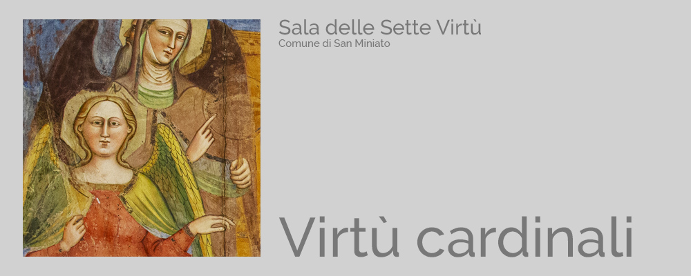 Siamo le virtù cardinali, la Giustizia, la Prudenza, la Fortezza e la Temperanza; come le tre Virtù sopra di noi ispirammo il buon governo del Vicario Guicciardini. La nostra è una lunga storia, già Platone parla di noi (Repubblica, 47a) e poi Cicerone (De Officiis, I,5). E’stato Sant’Ambrogio che ci ha trasportate nel mondo Cristiano, nel IV secolo dopo Cristo. Anche noi abbiamo le ali perché, come le nostre sorelle, siamo intelligenze angeliche della seconda gerarchia. Nel Medioevo siamo state spesso raffigurate accanto alle immagini dei re, a guidarne le azioni, o alla Madonna in trono, come qui a S. Miniato. Il nostro affresco è uno dei pochissimi che ci raffigura insieme alla Fede, alla Speranza e alla Carità. I nostri segni di riconoscimento sono la bilancia e la spada per la Giustizia, uno specchio per la Prudenza, la spada e la corazza per la Forza, le ampolle dell’acqua e del vino per la Temperanza. La Giustizia tiene la bilancia perché misura esattamente i pesi delle colpe ed applica imparzialmente con la spada le giuste pene; la Prudenza guarda nello specchio perché con esso vede alle sue spalle; lo specchio allude anche a un passo del Libro della Sapienza che dice: “La Sapienza è uno splendido riverbero della luce eterna, specchio puro dell’attività di Dio, immagine della sua bontà” (Sap. 8,26); La Forza, la fermmezza nell’agire, è comprensibilmente armata per poter combattere contro il male; la Temperanza, la capacità di non eccedere, la dote del giusto equilibrio, mescola con criterio il vino e l’acqua delle ampolle.