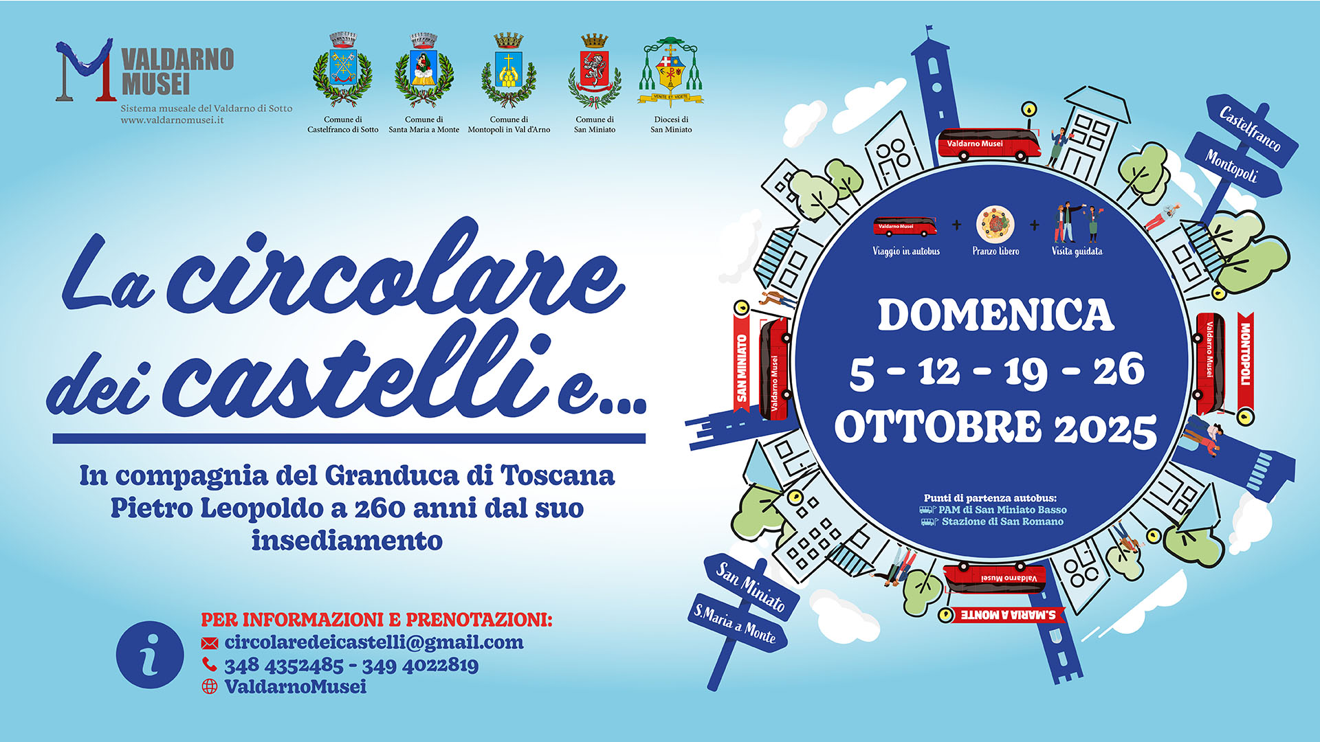 La circolare dei castelli consiste in un ciclo di visite guidate ai cinque centri storici (Castelfranco di Sotto, Marti, Montopoli in Val d’Arno, San Miniato e Santa Maria a Monte) e a luoghi di interesse presenti nei territori, con trasporto bus/navetta coordinato e gratuito.Le viste toccheranno i cinque castelli nel corso di quattro giornate, ognuna dedicata a due centri storici diversi e ai loro territori.