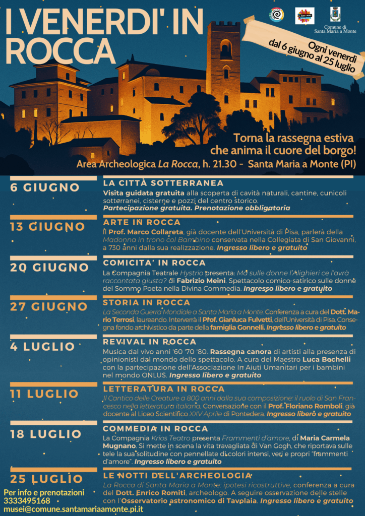 Ogni venerdì sera dal 6 giugno al 25 luglio, a partire dalle ore 21.30, sarà il suggestivo scenario dell’Area Archeologica La Rocca ad ospitare la programmazione estiva. La rassegna verrà inaugurata il 6 giugno dalle sempre affascinanti visite guidate alla città sotterranea, mentre i 730 anni dalla sua realizzazione saranno l’occasione il 13 giugno per una conferenza su La Madonna col Bambino, tenuta dal Prof. Marco Collareta. Sono previsti spettacoli teatrali (uno comico dal titolo Ma sulle donne l’Alighieri ce l’avrà raccontata giusta? presentato il 20 giugno da Hystrio Teatro, l’altro il 18 luglio una commedia ispirata alla vita di Van Gogh, Frammenti d’amore, messo in scena da Krios Teatro), conferenze sulla storia locale (La Seconda Guerra Mondiale a Santa Maria a Monte, il 27 giugno alla presenza del Prof. Gianluca Fulvetti) e sulla letteratura (presentata l’11 luglio dal Prof. Floriano Romboli su Il cantico delle Creature a 800 anni dalla sua composizione), serate musicali (una rassegna canora dedicata al revival anni 60-70-80 il 4 luglio), fino ad arrivare alle Notti dell’Archeologia, abbinate all’osservazione delle stelle in collaborazione con l’Osservatorio Astronomico di Tavolaia (25 luglio).