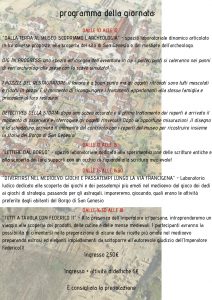 Domenica 12 maggio dalle ore 10 alle ore 18, l’Area Archeologica e il Museo di San Genesio si animeranno grazie a “Il borgo prende vita: usi e costumi lungo la via Francigena“, una giornata dedicata al Medioevo e alla riscoperta dell’antico Borgo di San Genesio, con visite animate e laboratori ludico-didattici per bambini e adulti. L’evento, patrocinato dal Comune di San Miniato, è organizzato dalla Cooperativa La Pietra d’Angolo onlus in collaborazione con l’ Associazione Professionale Archeo&Tech e San Miniato Comitato Manifestazioni Popolari ed è realizzato con il sostegno di Icos srl Scatolificio San Miniato. La giornata, dedicata a ragazzi e famiglie, sarà densa di appuntamenti. Dalle 10 alle 12 si comincerà con “Dalla terra al museo: scopriamo l’archeologia”, uno spazio laboratoriale dinamico alla scoperta del sito di San Genesio e del mestiere dell’archeologo, con attività pratiche di simulazione di scavo, indagine sui reperti e loro restauro! Dalle 12 alle 15 “Lettere dal borgo”, uno spazio tutto dedicato alla sperimentazione delle scritture antiche e alla scoperta dei loro supporti, con un occhio di riguardo alla scrittura medievale. Si continuerà nel pomeriggio con un divertente laboratorio tutto da giocare che farà scoprire ai partecipanti i giochi e i passatempi più amati del medioevo. Dalle 16.30 invece “Tutti a tavola con Federico II”, un viaggio alla scoperta dell’alimentazione medievale alla presenza dell’Imperatore in persona! Vi aspettiamo numerosi all’Area Archeologica di San Genesio (via Capocavallo San Miniato- incrocio via Tosco-Romagnola). Costi: ingresso 2,50€, ingresso + attività didattiche 5€. E’ consigliata la prenotazione. Per Informazioni e prenotazioni scrivere all’indirizzo sistemamuseale@comune.san-miniato.pi.it oppure telefonare ai seguenti numeri: 348 7187908 oppure 0571 406293.