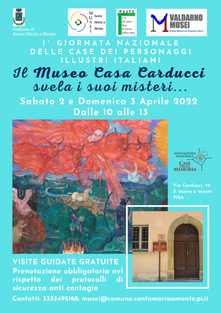 E Santa Maria a Monte ci sarà con il Museo Casa Carducci. L’apertura, prevista per Sabato 2 e Domenica 3 Aprile dalle 10 alle 13, avverrà su prenotazione e consisterà in visite guidate gratuite alla mostra permanente “Tenero Gigante”, 26 opere tra dipinti e disegni che Antonio Possenti ha dedicato alla vita di Giosuè Carducci, la cui famiglia visse a Santa Maria a Monte dal 1856 al 1858. La visita terminerà presso l’Archivio Storico Comunale, dal quale verrà estratto il carteggio fra Michele Carducci, padre dell’illustre Giosuè, e il Gonfaloniere di Santa Maria a Monte, allorquando la famiglia Carducci si trasferì presso “la fiorita collina tosca”.
