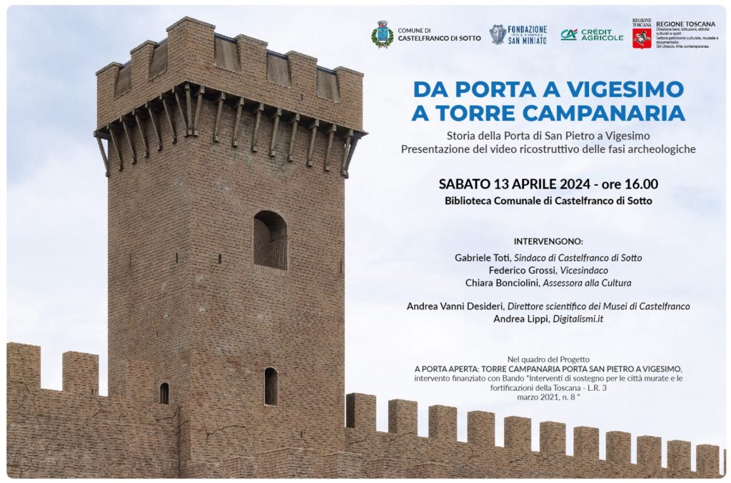 Tali interventi, realizzati nell’ ambito del progetto “A Porta Aperta: Torre Campanaria Porta San Pietro a Vigesimo”, sono stati finanziati dalla Regione Toscana (bando “Interventi di sostegno per le città murate e le fortificazioni della Toscana – L.R. 3 marzo 2021 n.8”) e da Fondazione Cassa di Risparmio di San Miniato e Crédit Agricole.