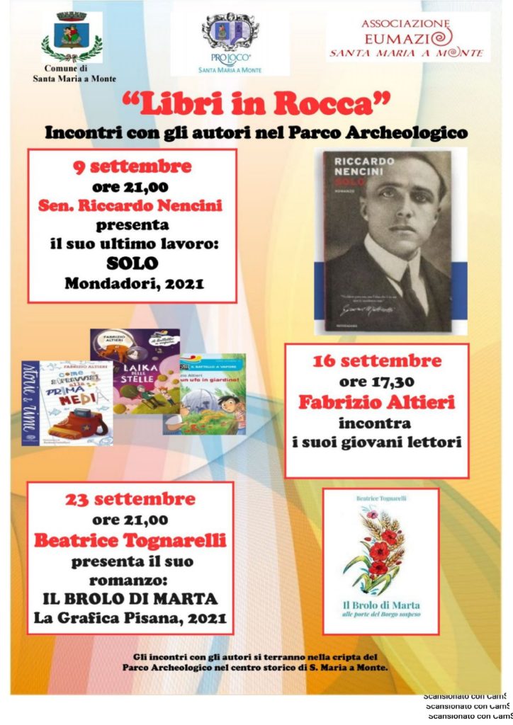 Ricominciare a parlare di libri “in presenza”, facendo incontrare gli autori con i lettori, dopo mesi di iniziative on-line. Questo l’obiettivo dell’iniziativa Libri in Rocca, promossa dell’Associazione “Eumazio”, in collaborazione con la Biblioteca Comunale di Santa Maria a Monte ed il patrocinio della Pro Loco. Il ciclo, di tre incontri – da Giovedì 9 Settembre a Giovedì 23 Settembre –, si svolgerà all’interno della cornice dell’Area Archeologica La Rocca di Santa Maria a Monte.