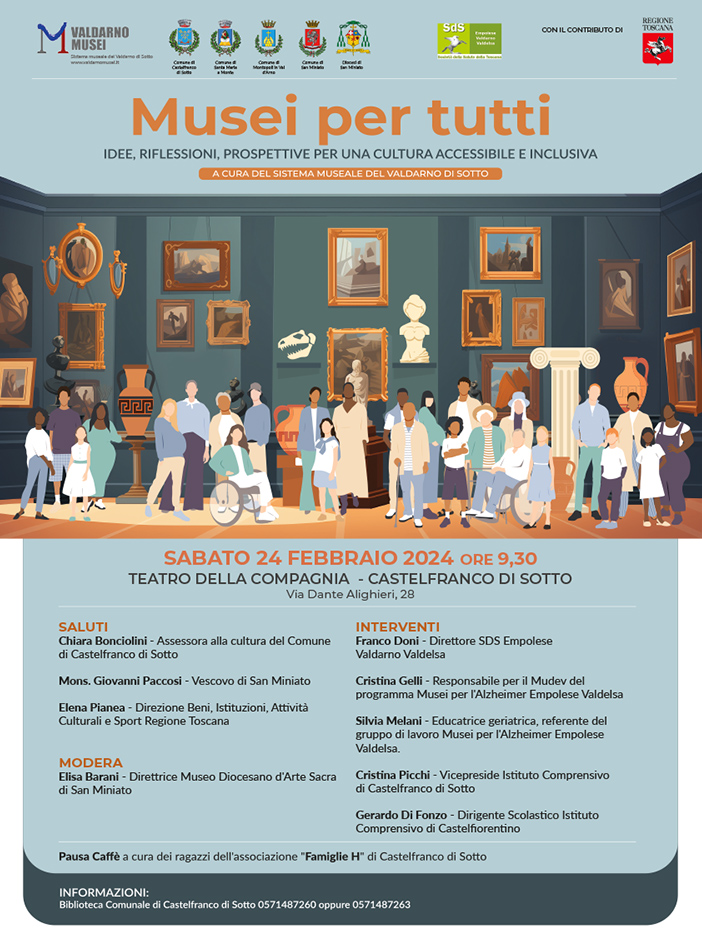 Il Sistema Museale del Valdarno Inferiore promuove un’occasione di confronto e scambio su queste tematiche, sabato 24 febbraio, con un convegno organizzato presso il Teatro della Compagnia di Castelfranco di Sotto dal titolo “Musei per tutti. Idee, riflessioni, prospettive per una cultura accessibile e inclusiva”. Una giornata formativa dedicata al tema dell’accessibilità ai musei.
