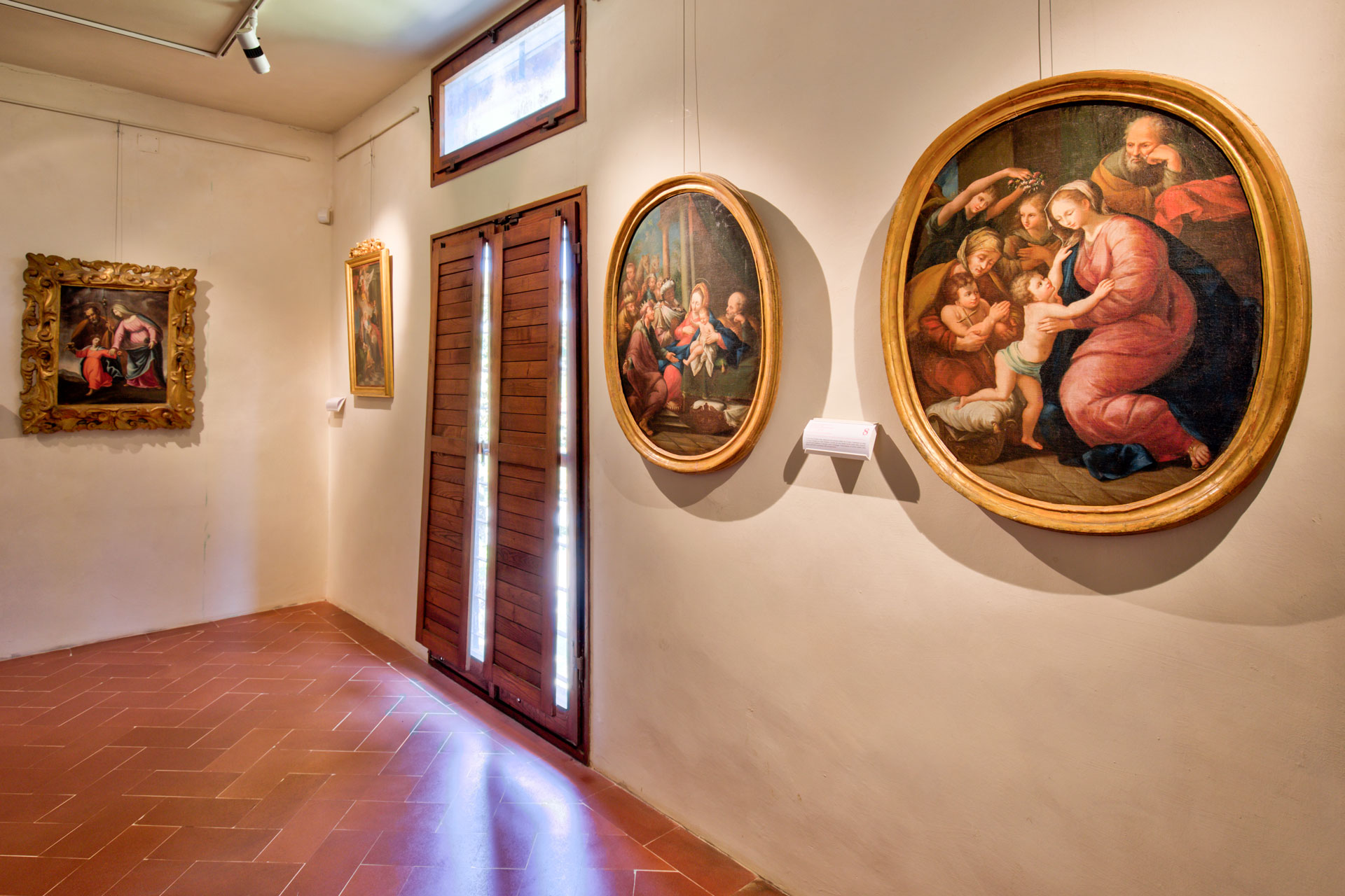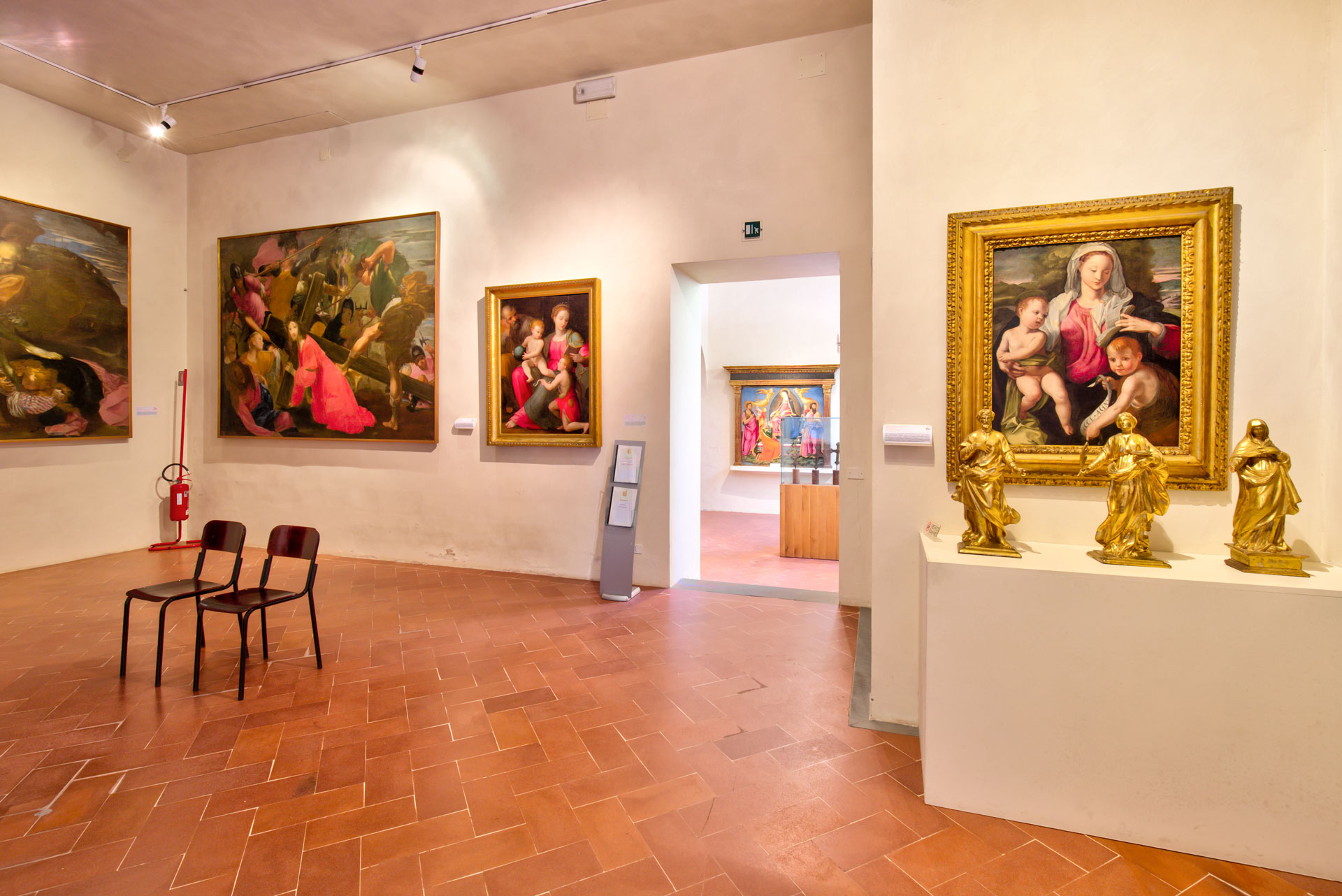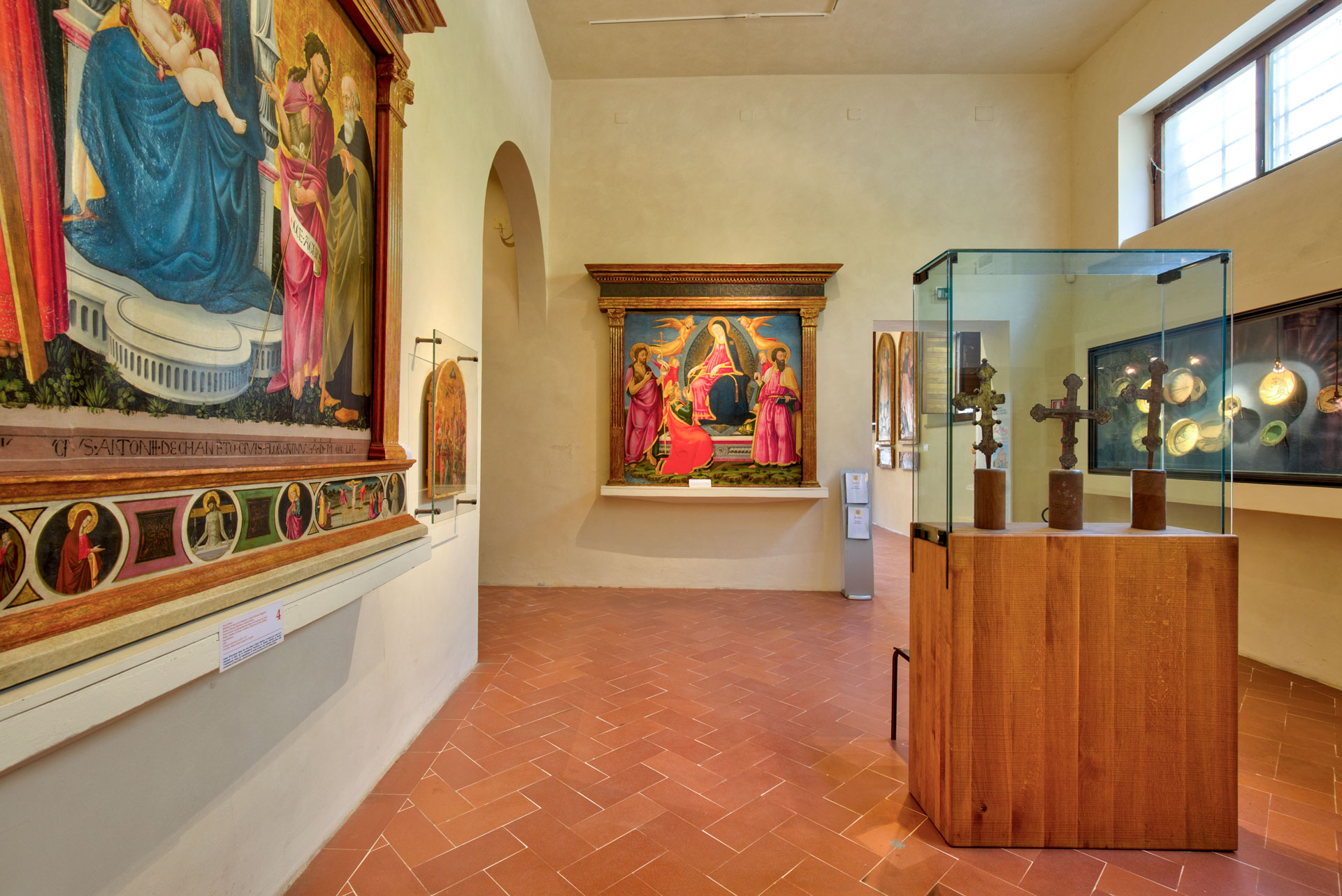 Sono presenti parti rimosse di affreschi, tavole lignee, bassorilievi, statue lignee, croci bronzee, bacini ceramici, tele e un modellino in scala originale raffigurante la chiesa del SS. Crocifisso. Nominiamo qui di seguito alcuni  artisti di cui potrete ammirare l’operato: Maestro Francesco, Lorenzo Monaco, Rossello di Jacopo Franchi, Giroldo di Jacopo da Como, Jacopo di Mino del Pellicciaio o “Maestro degli Ordini”, Borghese di Pietro Borghese, Cenni di Francesco di Ser Cenni, Agnolo di Polo allievo di Verrocchio, Ludovico Cardi detto “il Cigoli”, Jacopo Chimenti detto “l’Empoli”, Lorenzo Lippi, Filippo Paladini, Giovanni Bilivert, Domenico Crespi detto “il Passignano”, Gianbattista Tiepolo, Camillo Sagrestani, Andrea Bonechi.