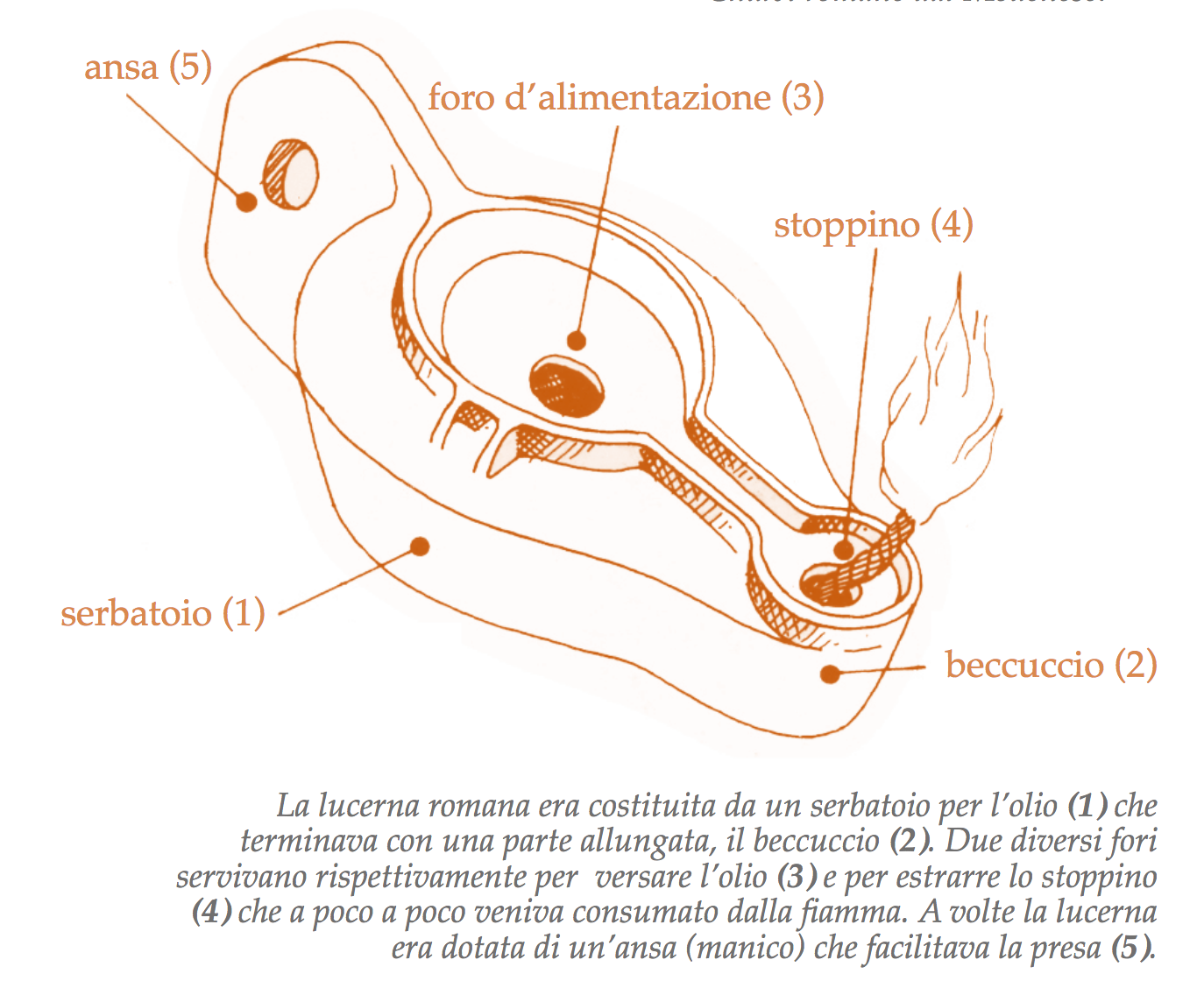 Nelle città romane l’illuminazione elettrica non esisteva: di notte si girava con le torce, mentre nelle case si provvedeva a fare luce anche con le candele e le lucerne. Queste ultime furono il mezzo di illuminazione da interni più diffuso nel mondo romano a partire dal I secolo a.C. Potevano essere in terracotta, in bronzo o anche in metallo prezioso, ed erano alimentate con l’olio di oliva o altri olii vegetali e minerali, ma anche con grassi animali.