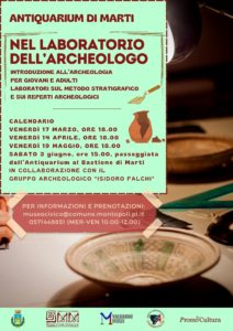 Venerdì 17 marzo alle ore 18.00, il primo dei 4 incontri “Nel laboratorio dell’archeologo”: corso di introduzione all’archeologia per giovani e adulti articolato in 4 incontri di cui il primo con la Direttrice del Sistema Museale Montopolese, seguiranno 2 incontri laboratori sul metodo stratigrafico e sul reperto archeologico condotti dagli operatori di PromoCultura e un incontro finale con passeggiata archeologica in collaborazione con il Gruppo Archeologico Isidoro Falchi. La sede delle attività sarà presso l’Antiquarium di Marti. Gli incontri si svolgeranno da marzo a giugno.