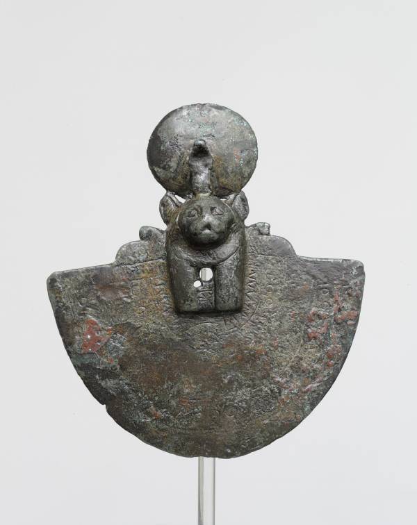 Pendente in bronzo raffigurante protome della divinità egizia Sekhmet. La testa di felino della dea, con parrucca tripartita, è sormontata da un ureo e dal disco solare. Sotto la protome il pendente, di forma semicircolare, è decorato con cerchietti e piccole linee diagonali incise. Ai lati della testa due probabili leonesse accosciate, retrospicienti. Piccolo foro sotto la testa, due ganci affiancati sul retro. Il bronzetto è databile tra il 600 e il 300 a. C.. Collezione Lotti.