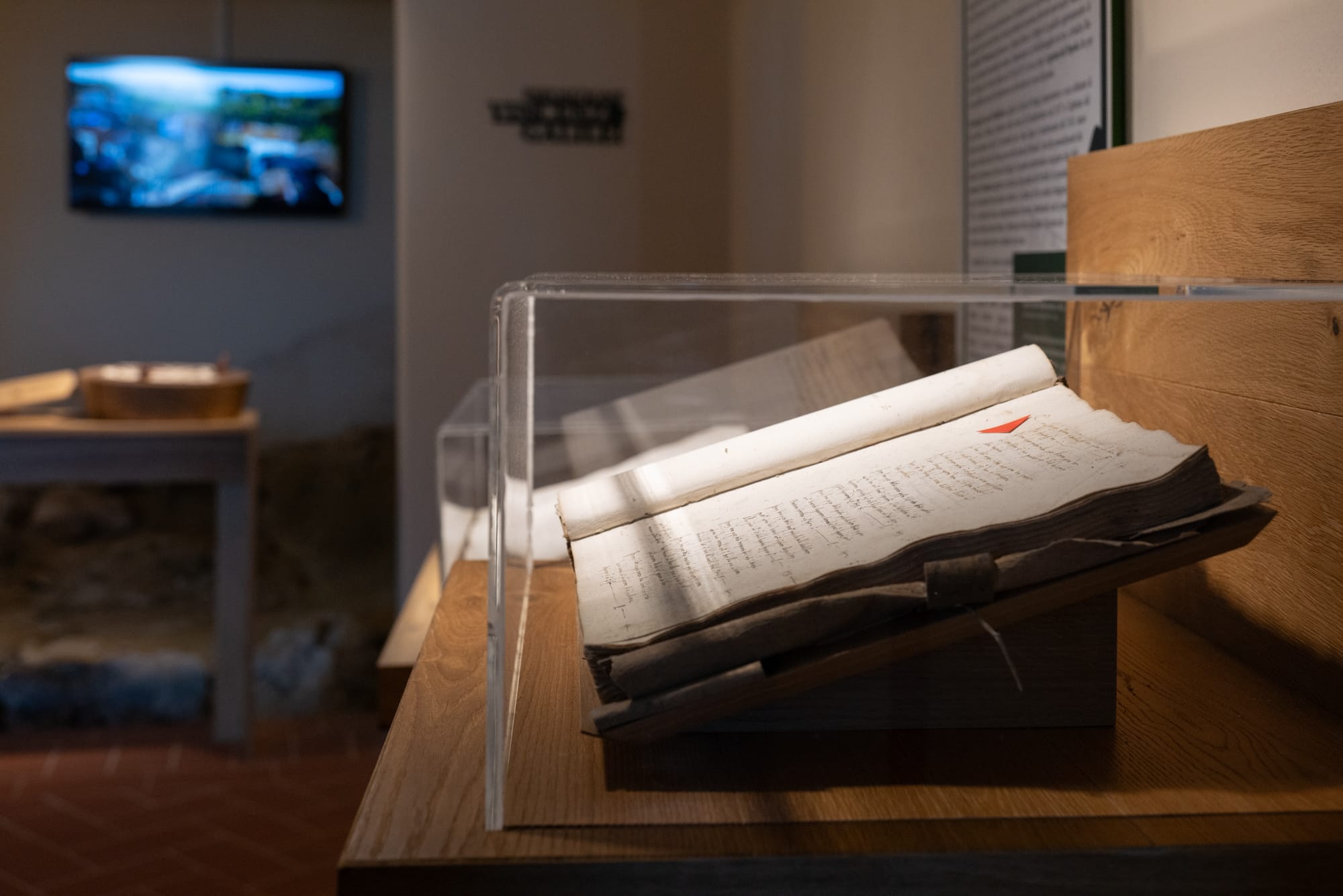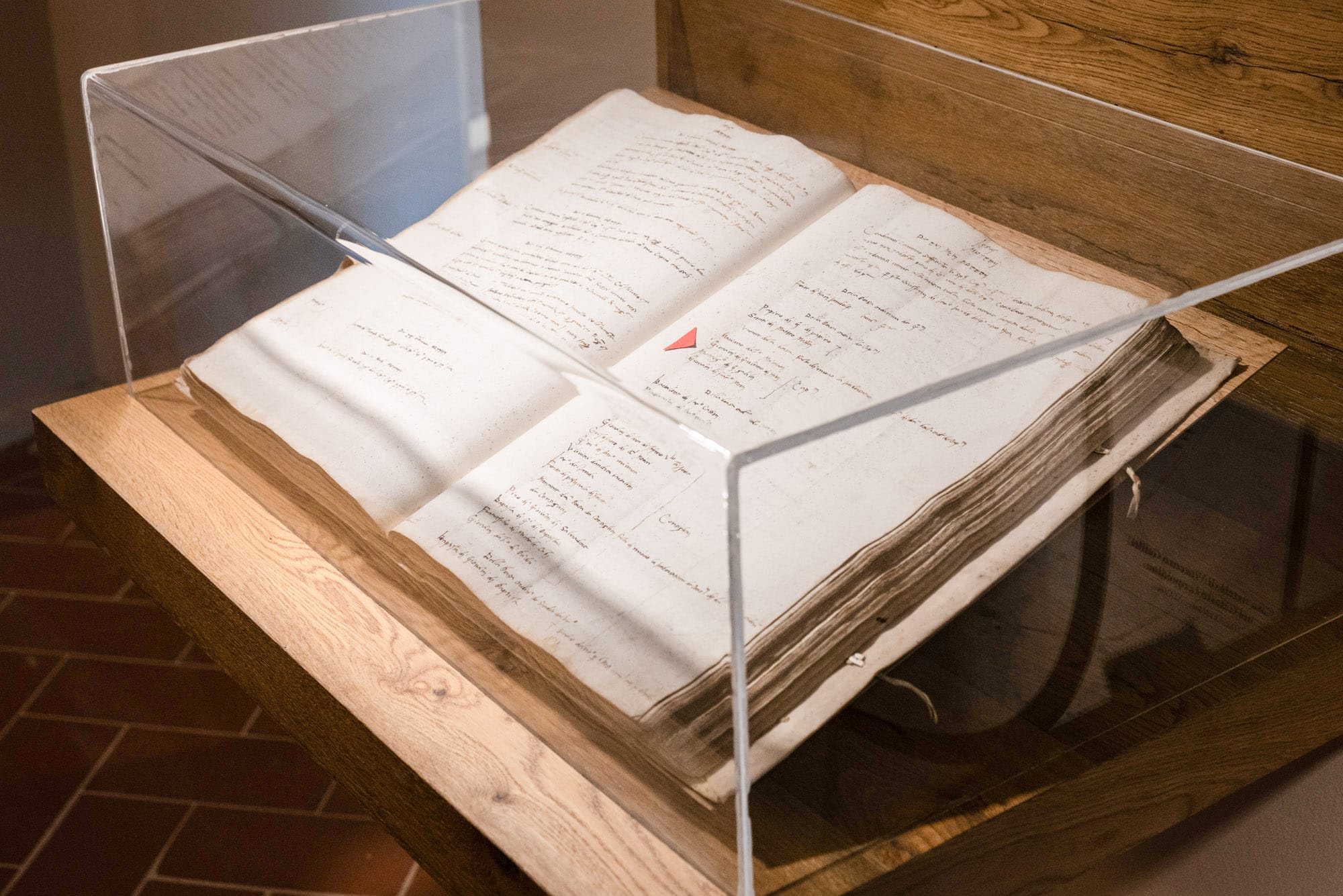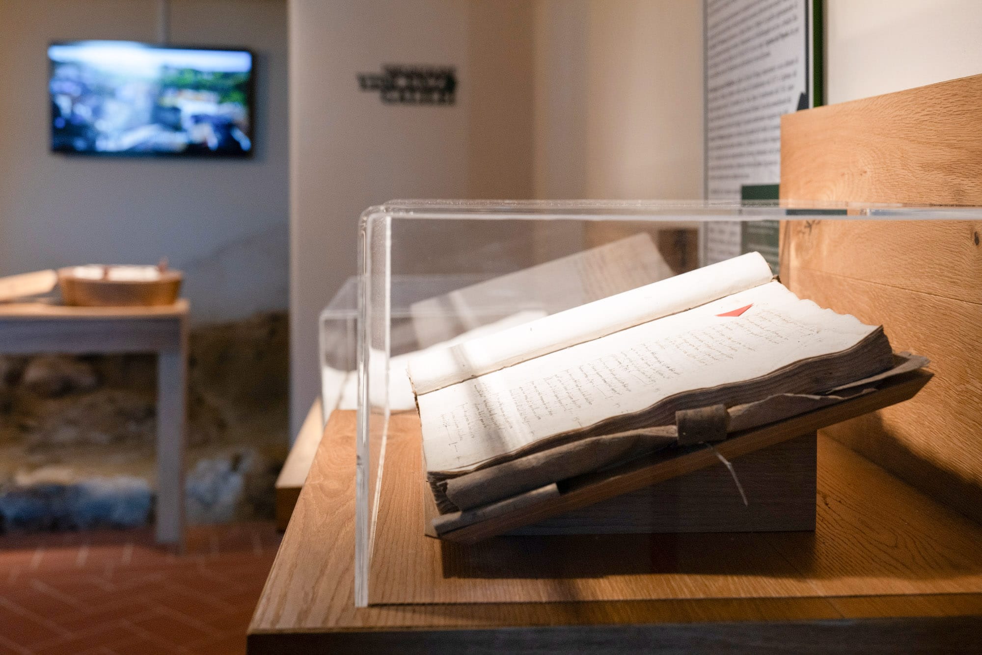 Vengono poi esposti due manoscritti di fondamentale importanza per il legame della famiglia Galilei con Santa Maria a Monte. Il primo è un faldone all’interno del quale, in una deliberazione datata 16 marzo 1532, il nome di un Galilei, esattamente Michelagnolo, padre di Vincenzo, compare per la prima volta fra i Capitani del Popolo che, collaborando con i Consiglieri, aiutavano il Gonfaloniere nelle varie decisioni da prendere. Il secondo è stato un documento di fondamentale importanza per l’identificazione della casa natale di Vincenzo. Si tratta di un registro dei Campioni dell’Estimo nel quale, tra i beni di Carlo di Bergo, futuro suocero di Michelangelo Galilei, compare una chaxa posta nella strada di Renaio: concessa probabilmente in dote alla figlia, fu la dimora nella quale Michelangelo e sua moglie Maddalena, novelli sposi, andarono ad abitare e dove nacque anche il figlio Vincenzo.