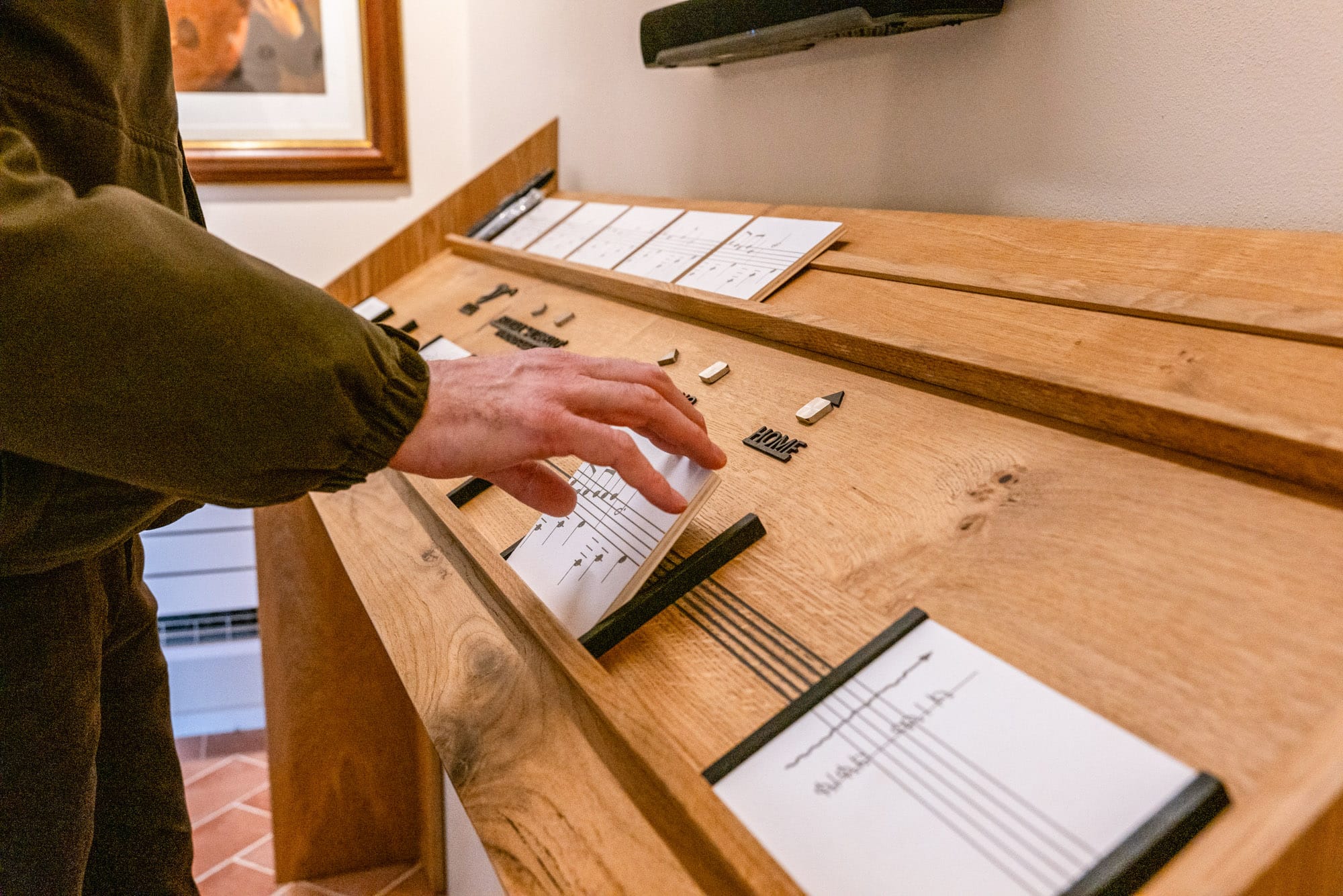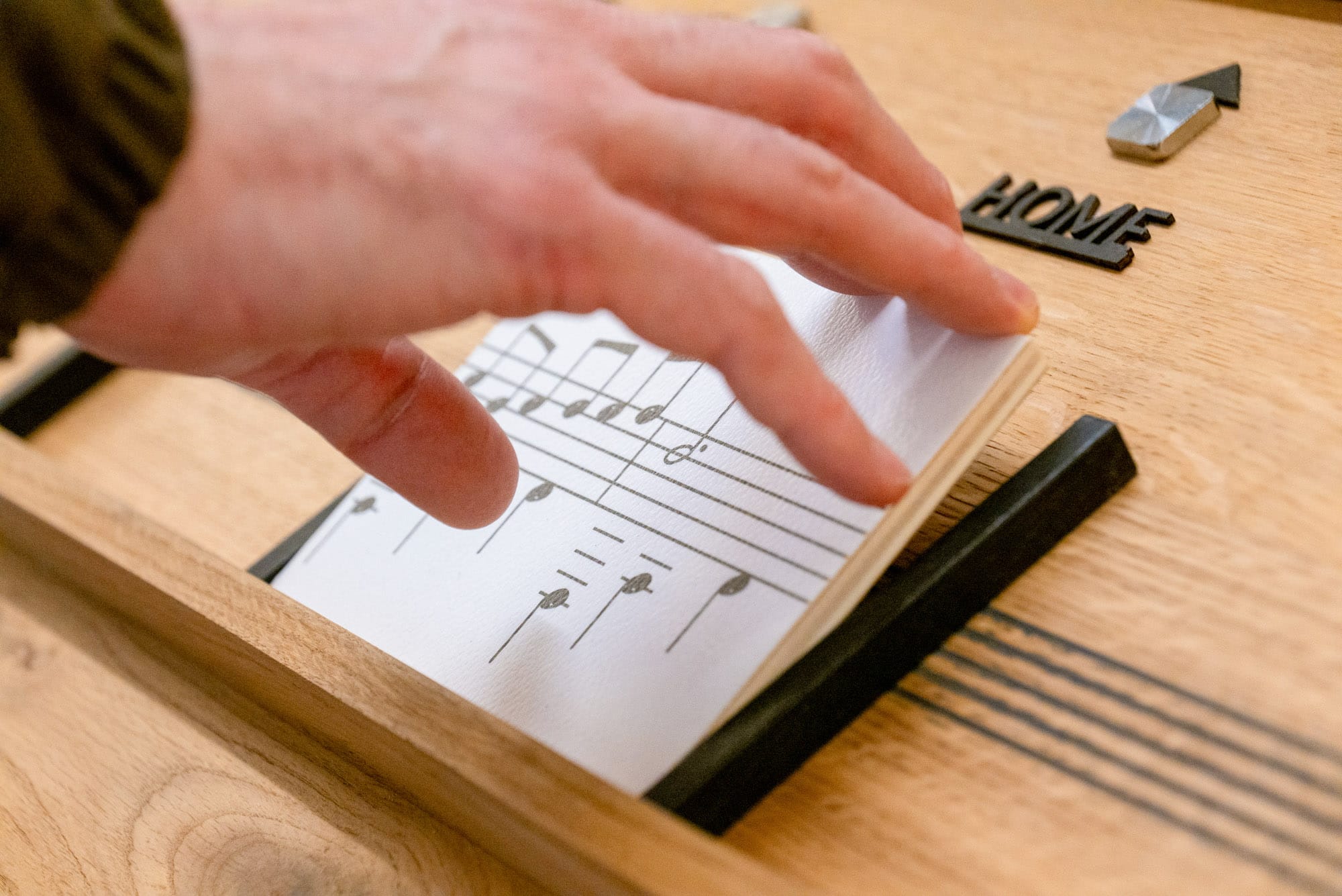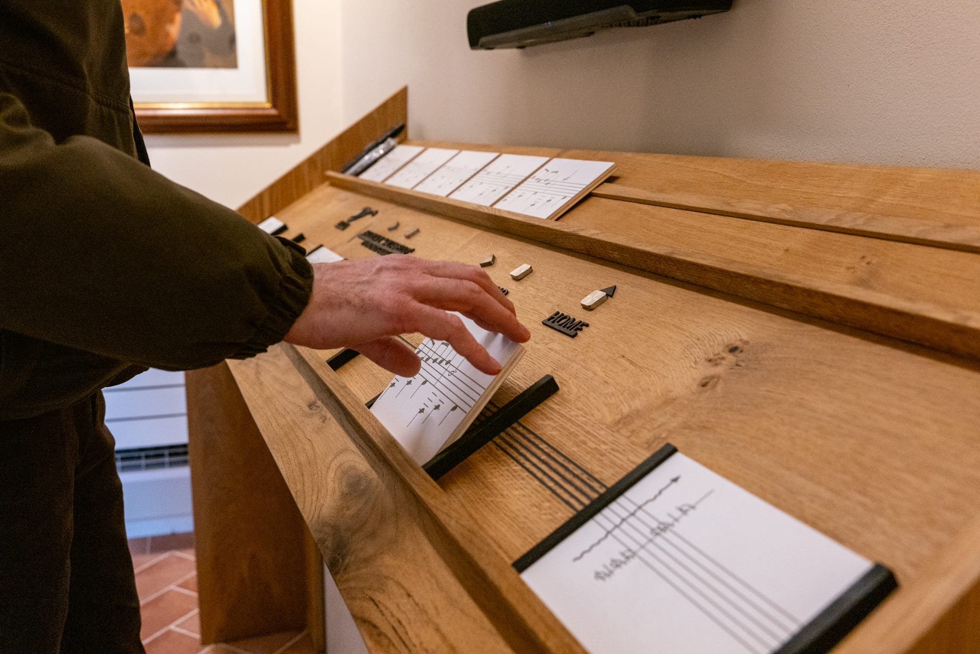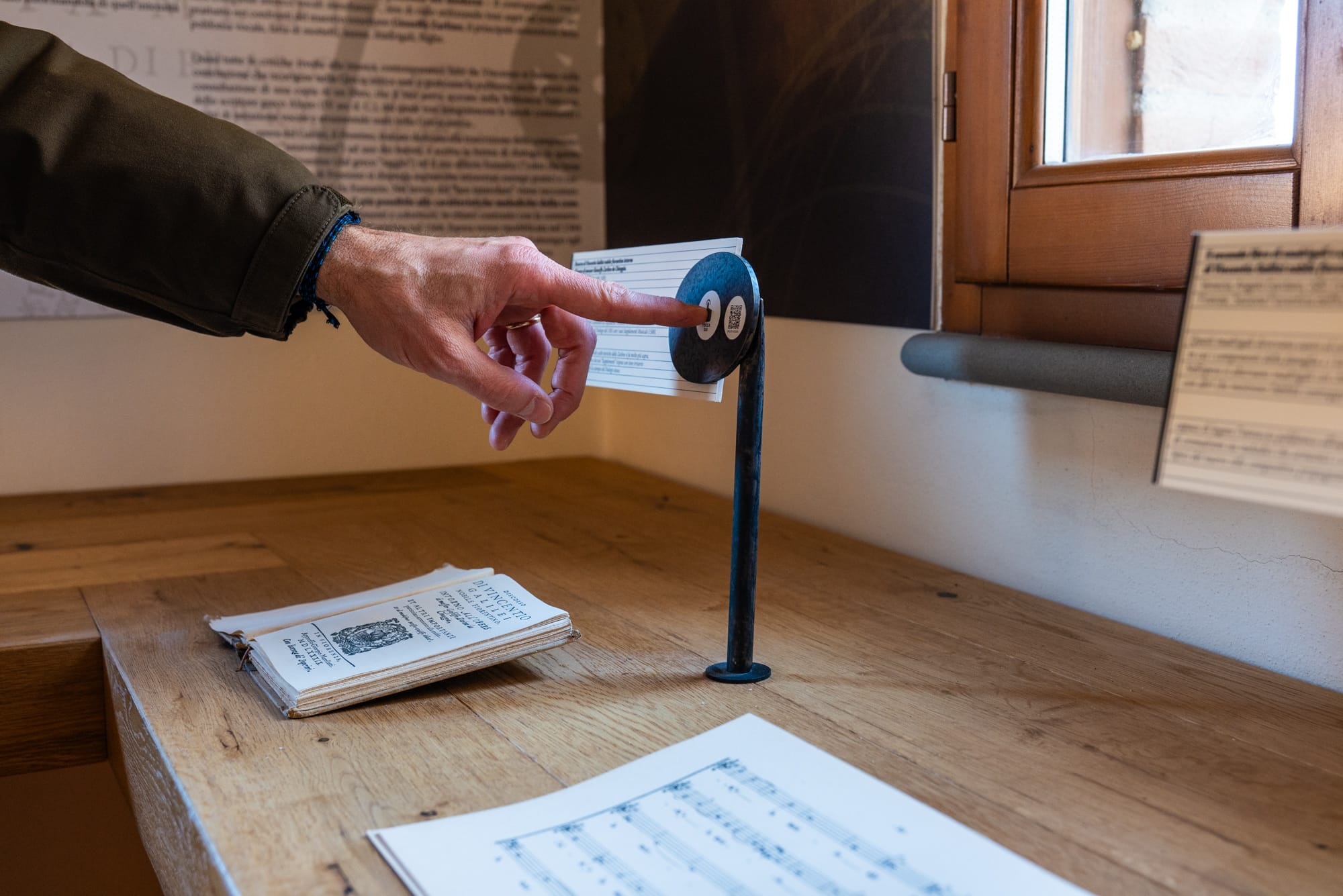 Il visitatore potrà infatti dapprima mettersi alla prova vestendo per un attimo i panni del “compositore”, ricreando un piccolo brano, per la precisione un “saltarello”, ossia una danza di tradizione popolare, di Vincenzo Galilei. Il tavolo sonoro, infatti, è una postazione multimediale che permette, dopo aver ascoltato un brano tratto dalla Intavolatura per liuto del 1584, di poterlo ricomporre sul pentagramma attraverso il posizionamento delle otto tessere sonore nelle quali è suddiviso o di poterlo rifare ex novo producendo un’altra melodia che potrai ascoltare!