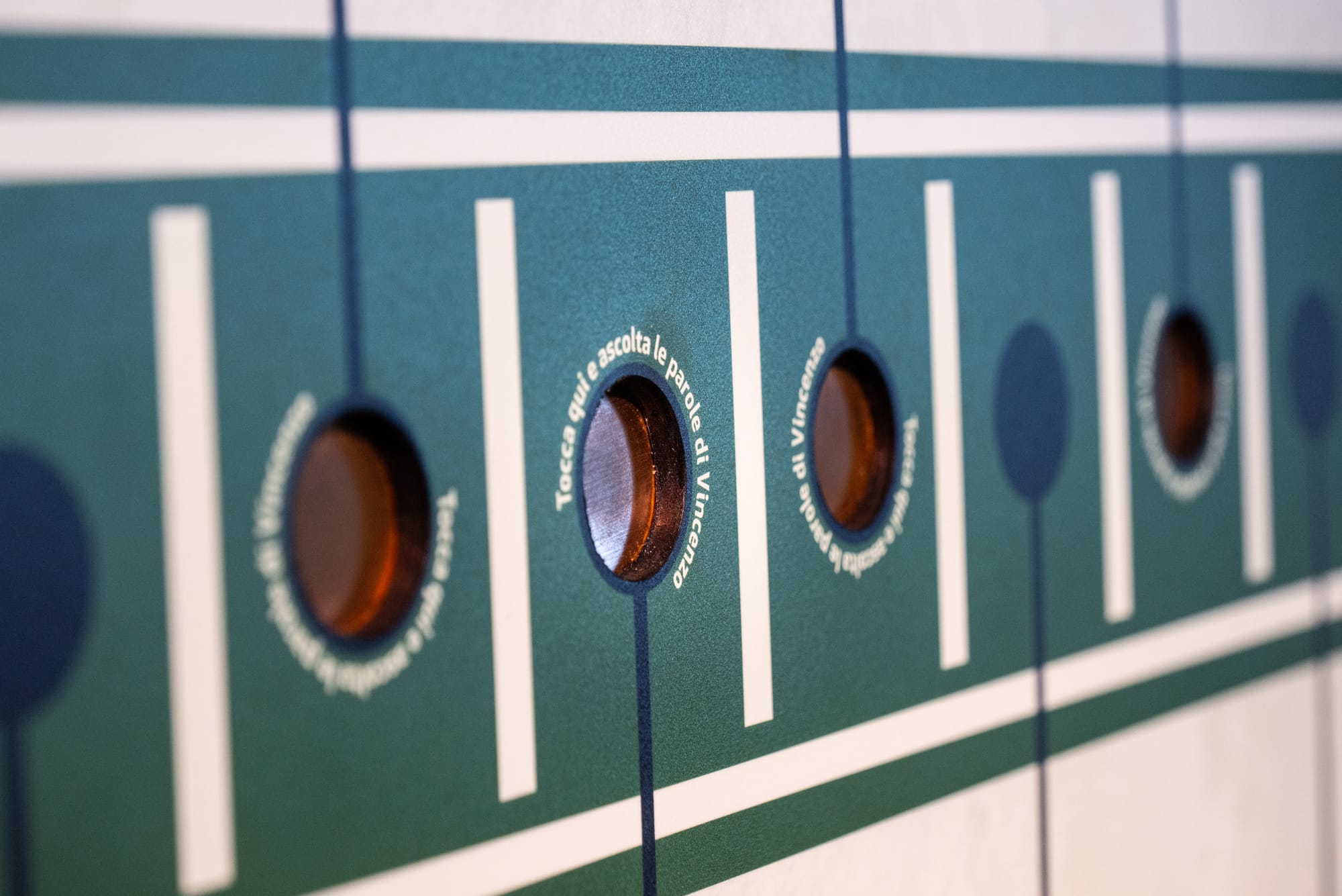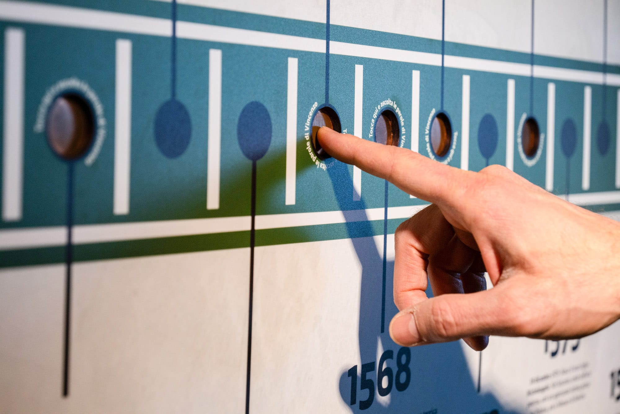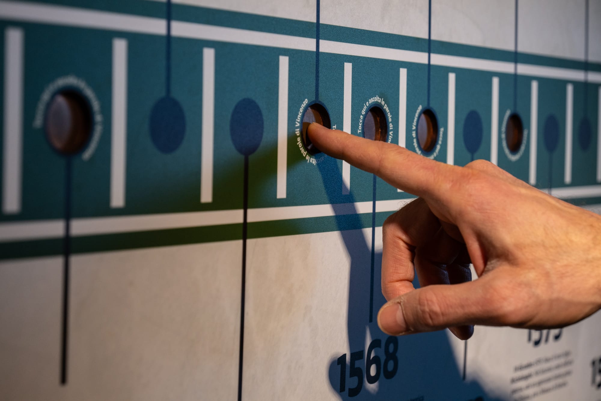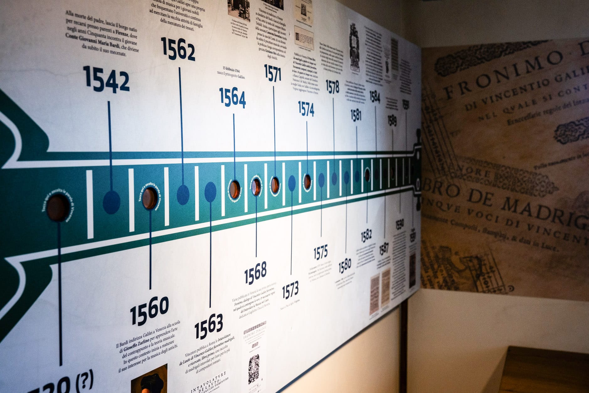 Sulla sinistra il visitatore troverà una linea del tempo parlante con gli avvenimenti principali della biografia familiare e professionale di Vincenzo, raccontati in prima persona da una voce narrante, attivabile ogni qual volta si toccheranno i tasti corrispondenti agli anni indicati, dal 1520, anno della sua nascita, fino al 1591, quando morì a Firenze.