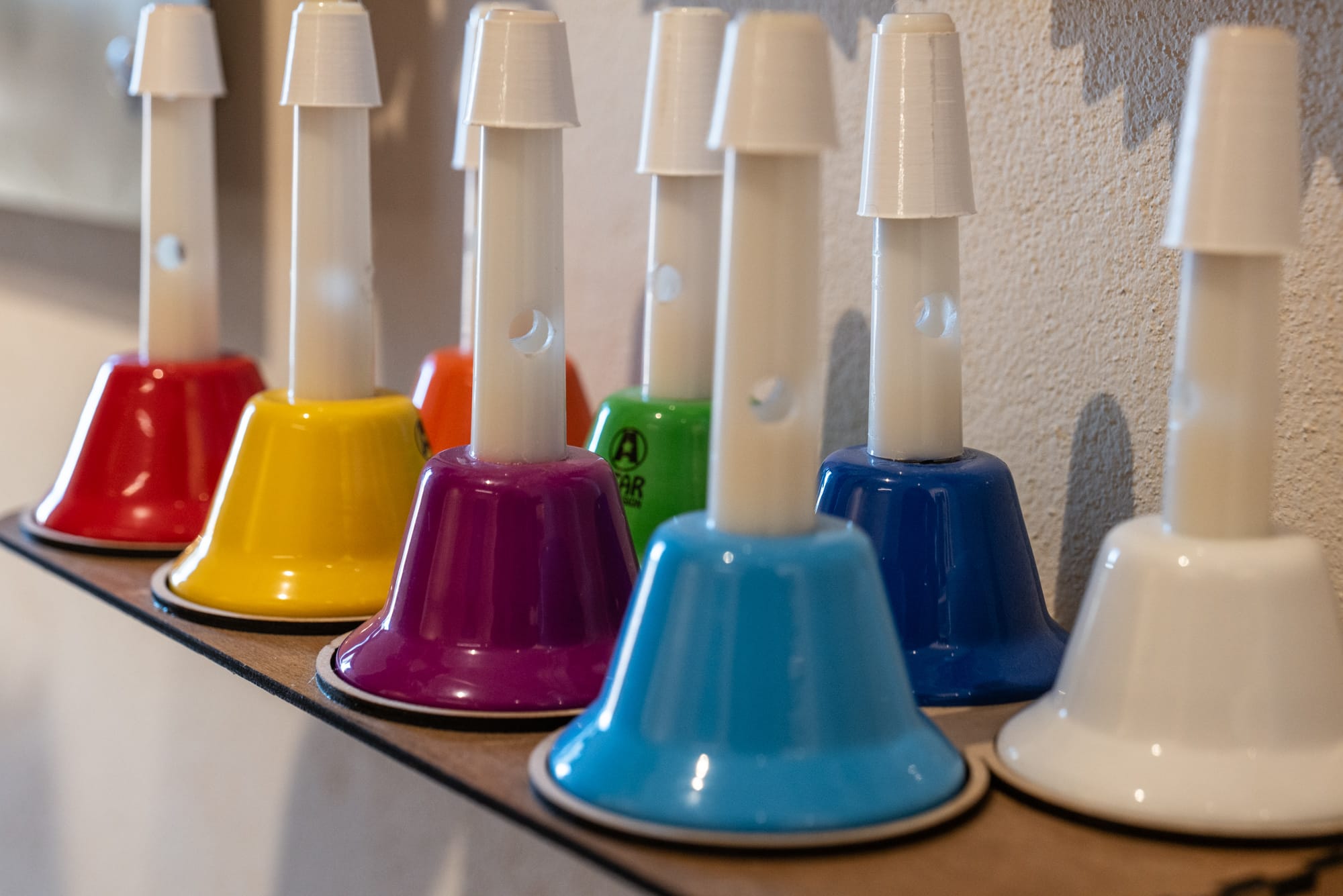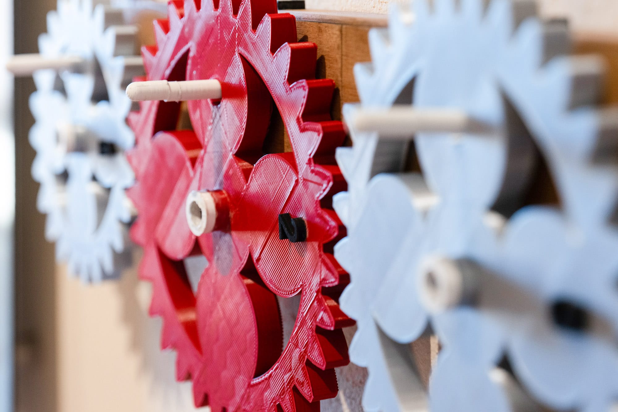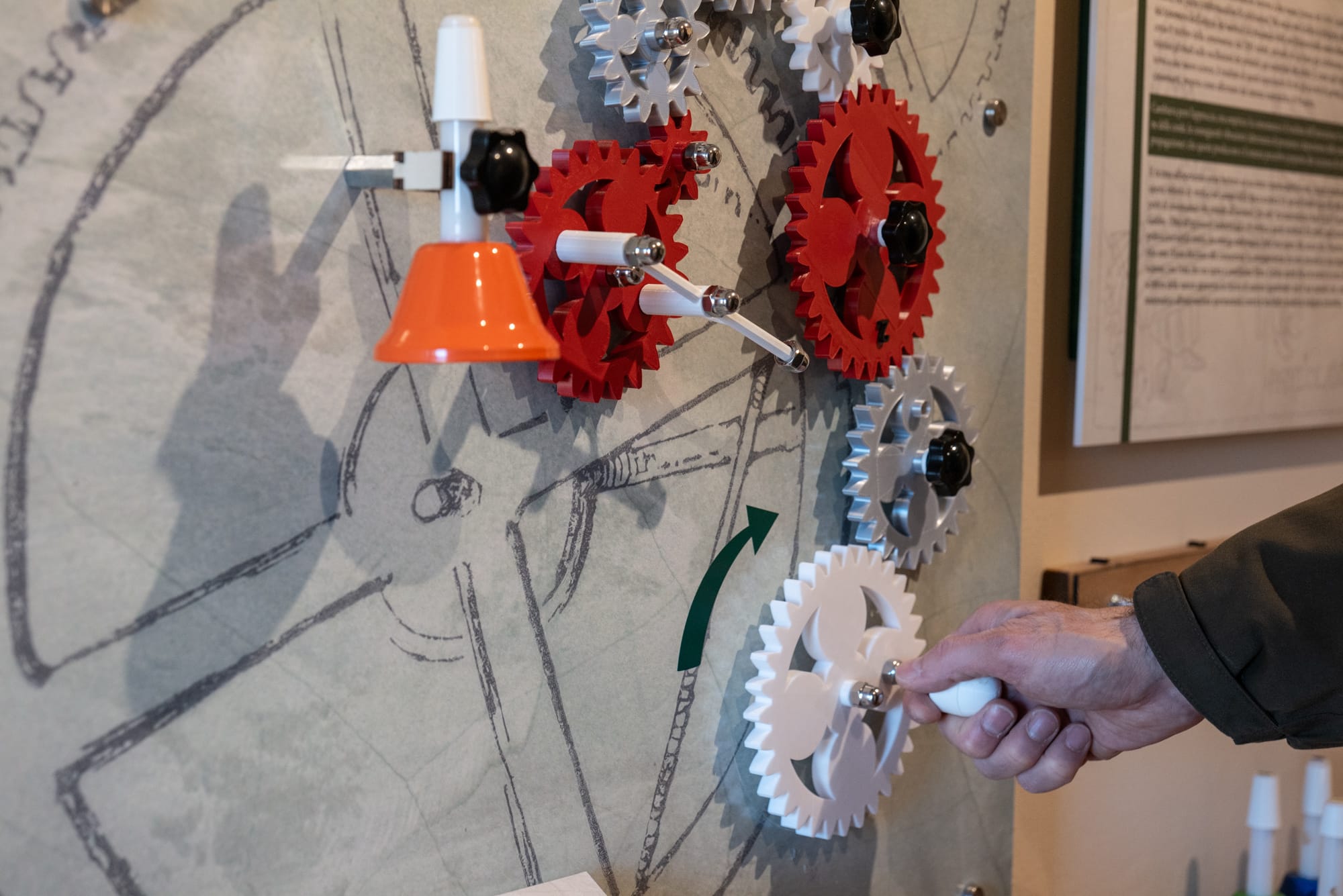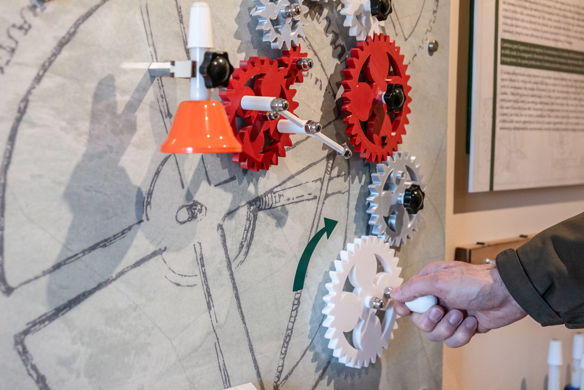 Lo scopo del pannello degli ingranaggi è proprio questo: scoprire attraverso l’esperienza quali sono i suoni consonanti e quali quelli dissonanti. Intanto chi si troverà di fronte alla postazione dovrà sperimentare sul campo quale possa essere la giusta successione tra gli ingranaggi presenti che, ciascuno contraddistinto da un diametro differente, andranno posizionati nel pannello per completare correttamente il meccanismo. Una volta composto, si dovranno collocare negli alloggi due fra le otto campanelle a disposizione, ognuna caratterizzata da una nota diversa. A questo punto il sistema andrà azionato tramite una manovella che attiverà due leve: queste colpendo le due campanelle simultaneamente, produrranno un suono. Assonante o dissonante? Cambiando le campanelle sarà possibile scoprire quali note stanno bene insieme, risultando gradevoli e morbide all’orecchio, e quali invece risultano aspre e stridenti.