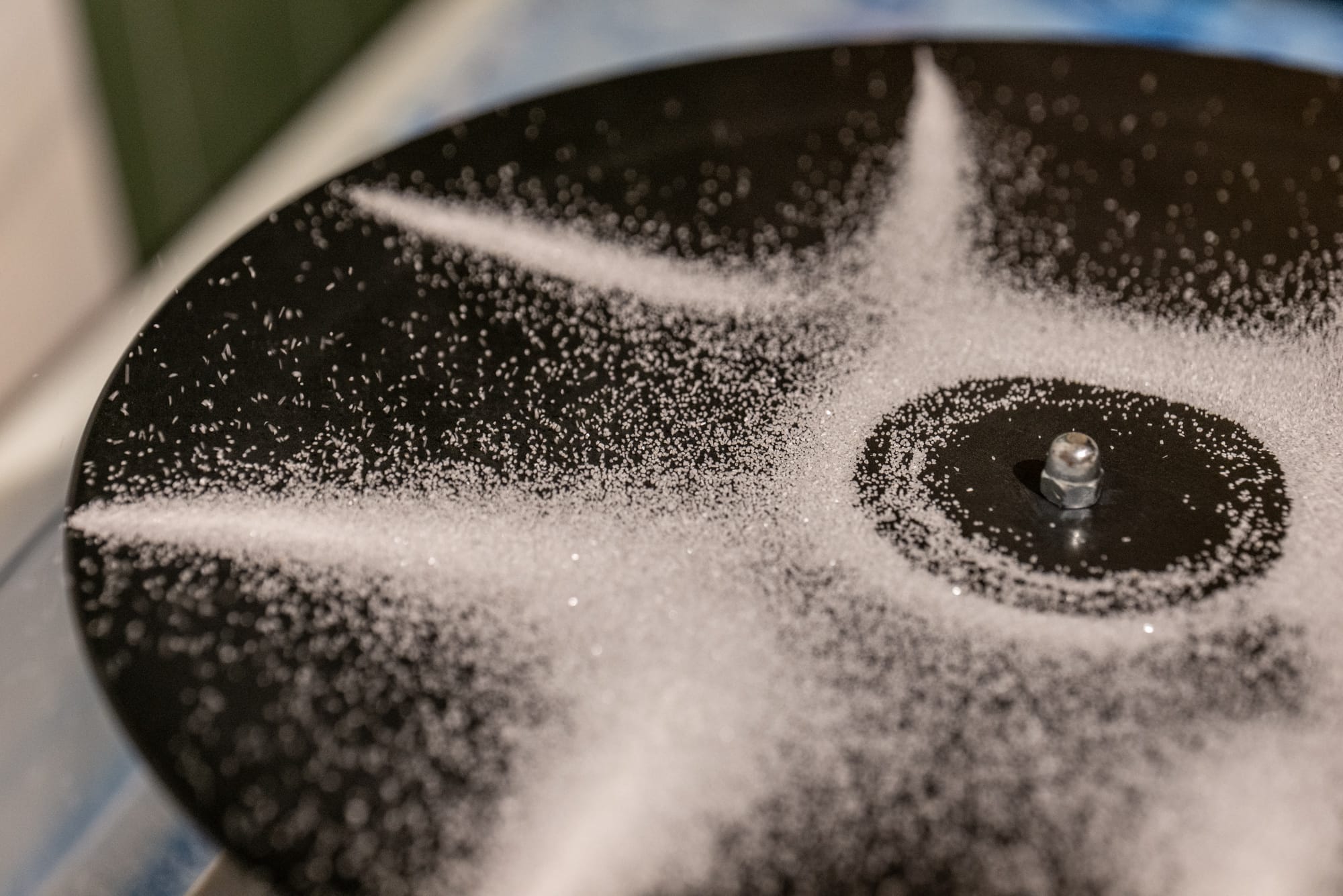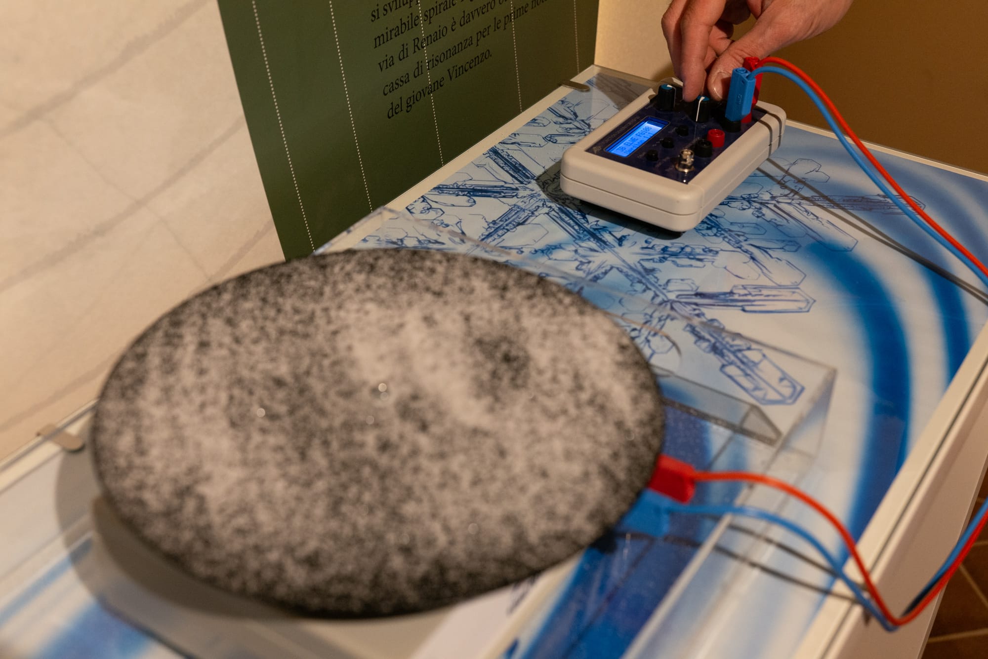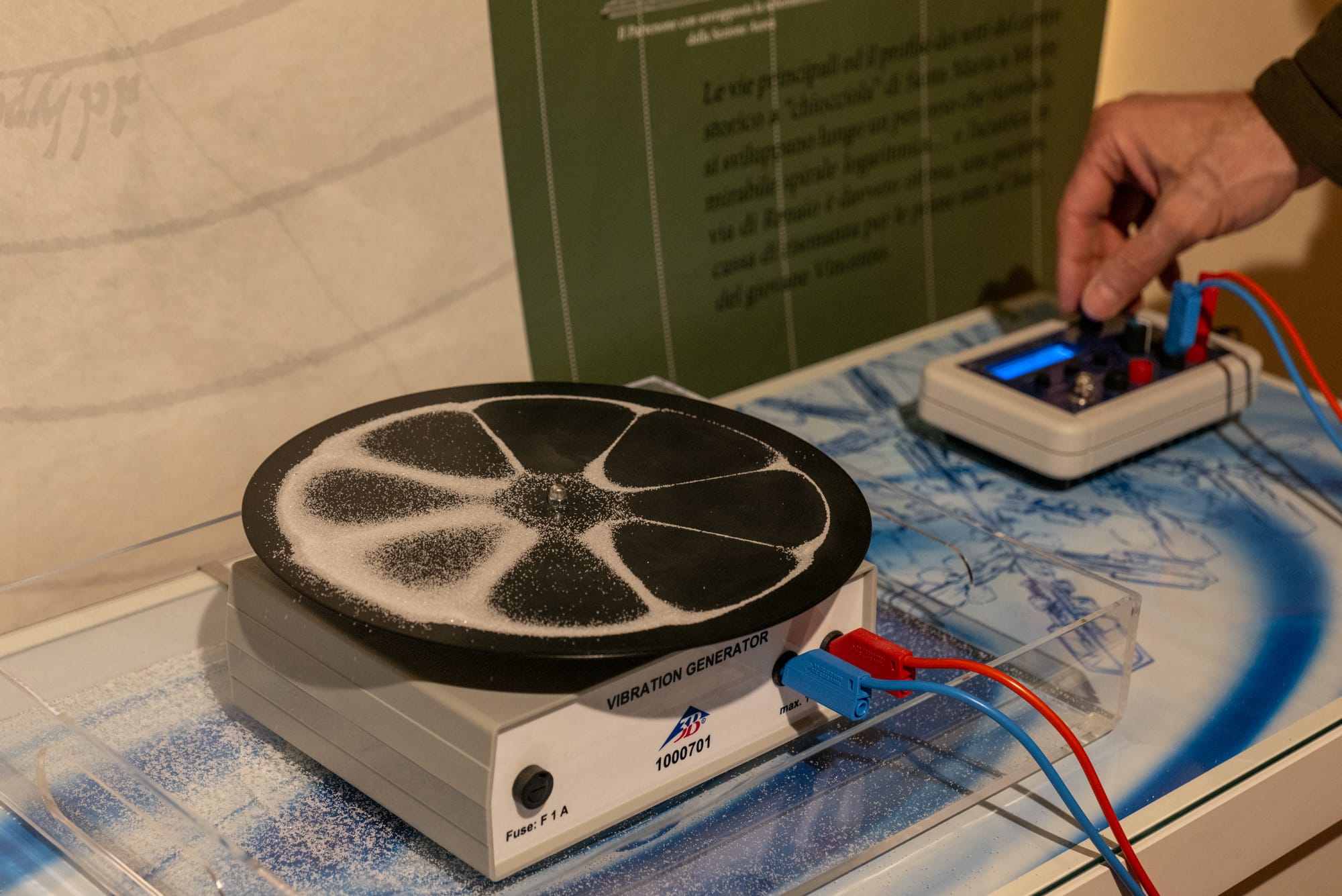 La prima postazione, detta piastra di Chladni (dal nome del suo inventore), si basa sulla teoria acustica secondo la quale il suono si muove nello spazio sotto forma di vibrazioni e si propaga per onde sferiche in modo uniforme in tutte le direzioni. E’ un vero e proprio esperimento che ci permette di “vedere” la musica e ciò che una vibrazione può generare. Infatti, se cospargiamo una piccola quantità di sabbia finissima su una lastra metallica collegata ad un generatore di onde sonore, si vedrà che al variare delle frequenze i granelli si spostano sulla lastra creando geometrie perfette. Dunque, è proprio l’azione vibrazionale della musica a ordinare il cosmo matematicamente e geometricamente, collegandosi in maniera suggestiva sia a quanto sostenne dapprima Platone, secondo cui il Demiurgo concepì il cosmo a sua immagine in base alle leggi matematiche dell’armonia musicale, sia a quanto poi è stato scoperto effettivamente dai cosmologi, i quali hanno compreso come l’Universo primordiale fosse stato attraversato da vibrazioni del tutto simili a quelle dei suoni che si propagano nell’aria.