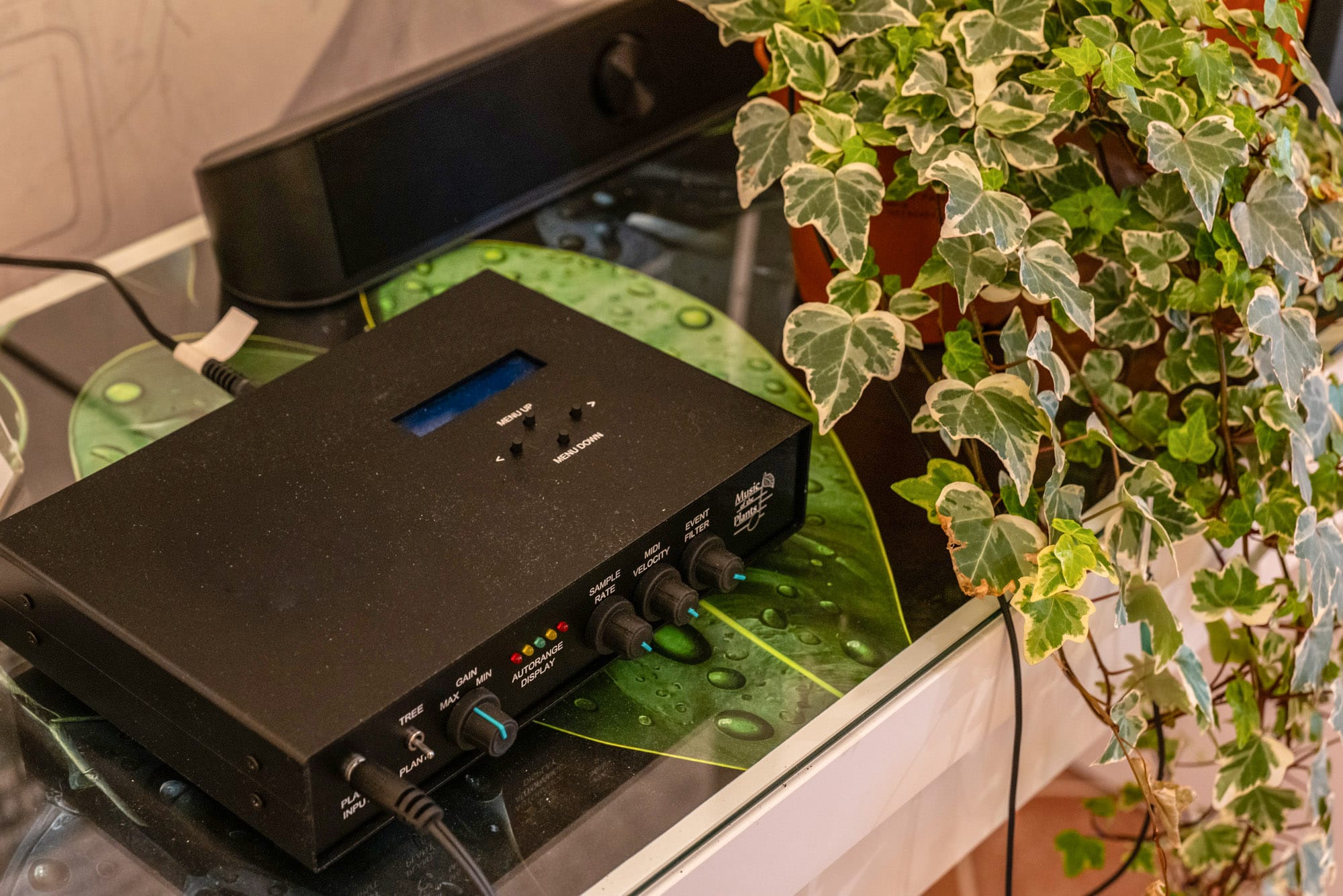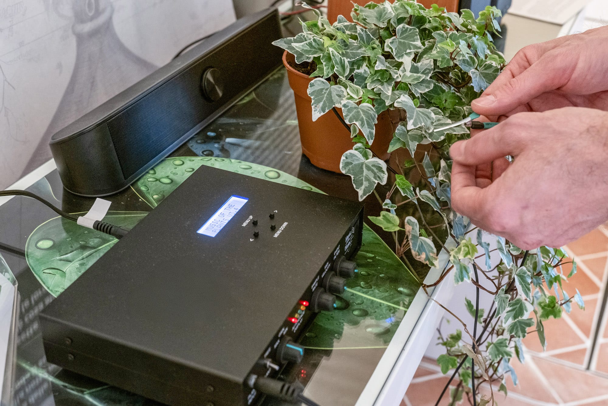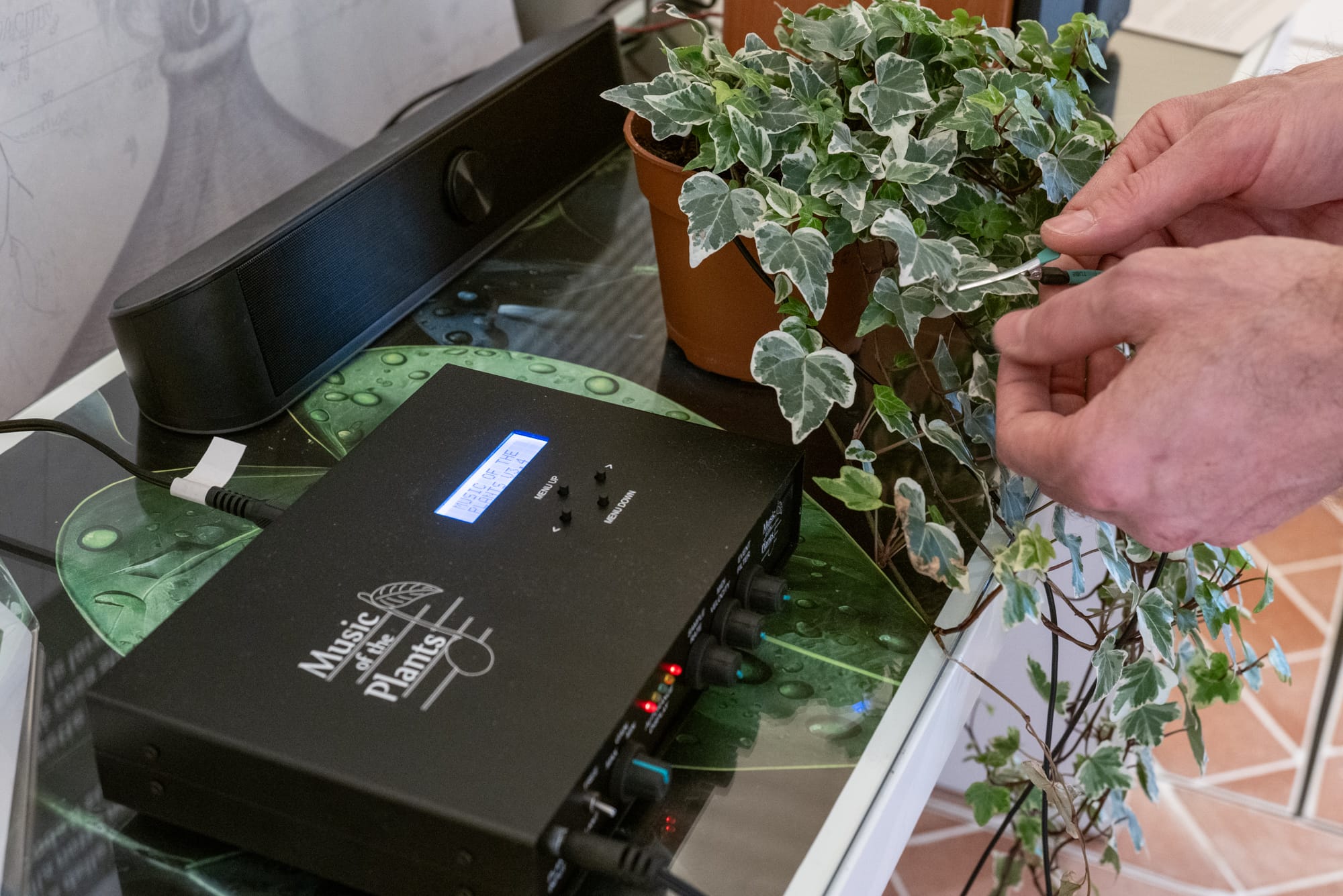 Infine, con la musica delle piante, il visitatore vedrà come quella stessa vibrazione sonora entri in contatto anche con il mondo vegetale, in una sorta di Canto del Creato in armonia col suo Creatore. In particolare, la neurobiologia vegetale fondata dal professor Stefano Mancuso, ci dice che le piante sono in grado di recepire segnali e stimoli esterni ed elaborarli per dare una risposta che permetta loro di sopravvivere e non solo. Tramite uno speciale apparecchio, attraverso due elettrodi posti uno alle radici e l’altro sulle foglie della pianta, sarà possibile rilevare le differenze di potenziale elettrico che si generano nella membrana cellulare attraverso il movimento linfatico foglia – radice. Convertite le variazioni di resistenza elettrica in segnali digitali e successivamente codificate, l’apparecchio restituisce le note in tempo reale, permettendo al visitatore di udire la “musica” della nostra piantina! Ecco allora che il risultato finale consiste nel poter udire ciò che normalmente non siamo in grado di vedere né tanto meno di percepire: il movimento vitale di una pianta e le sue reazioni “musicali” all’ambiente circostante.
