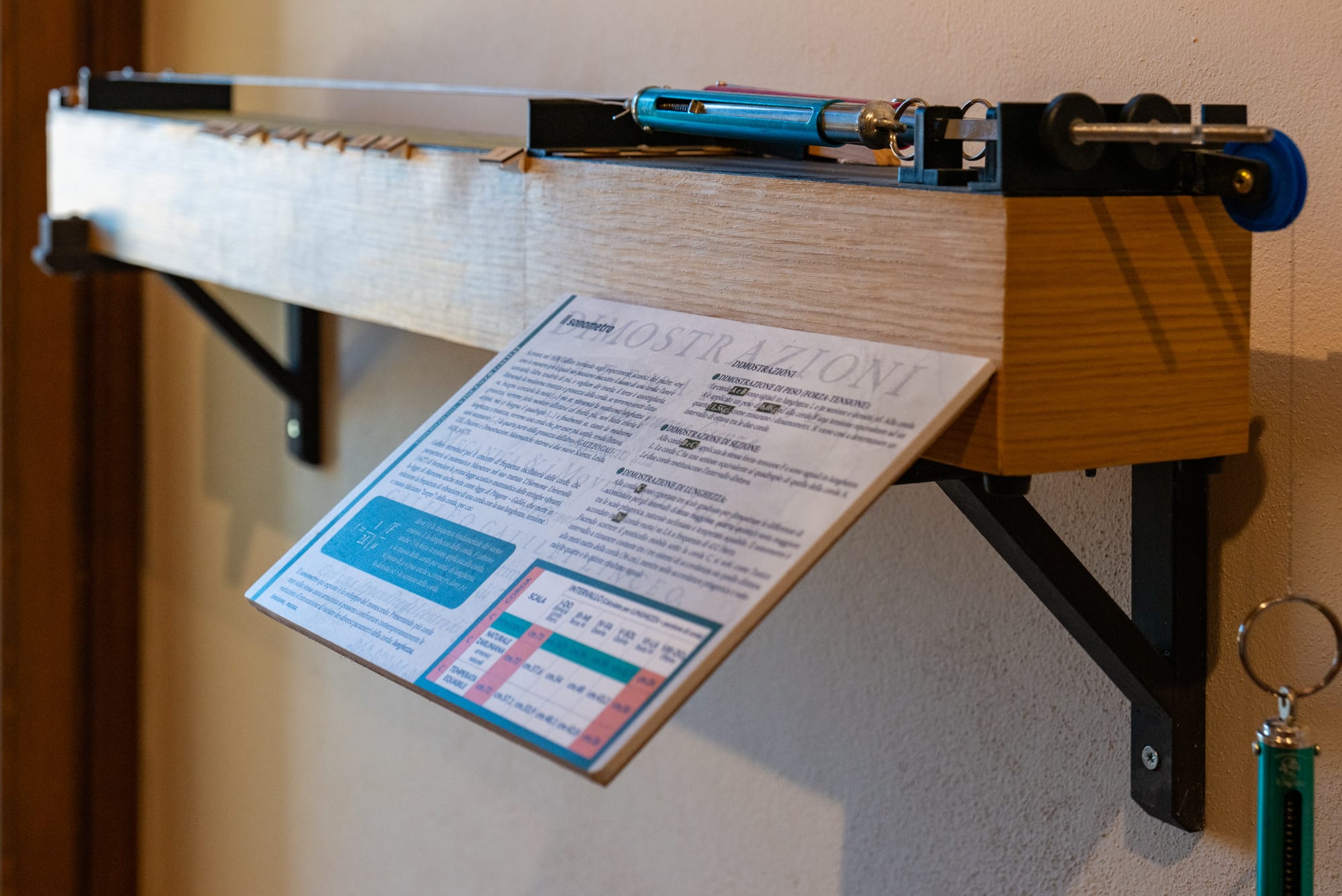 Infine, il sonometro esposto, sviluppo del monocordo sul quale Vincenzo sperimentava, presenta tre corde tese sulla stessa cassa armonica attraverso cui si possono confrontare contemporaneamente le variazioni d’intonazione al variare dei diversi parametri della corda: lunghezza, tensione, peso. In funzione dei rapporti delle lunghezze della corda, si scoprirà che le consonanze trovano la loro corrispondenza con i numeri razionali, espressi da rapporti di numeri interi.