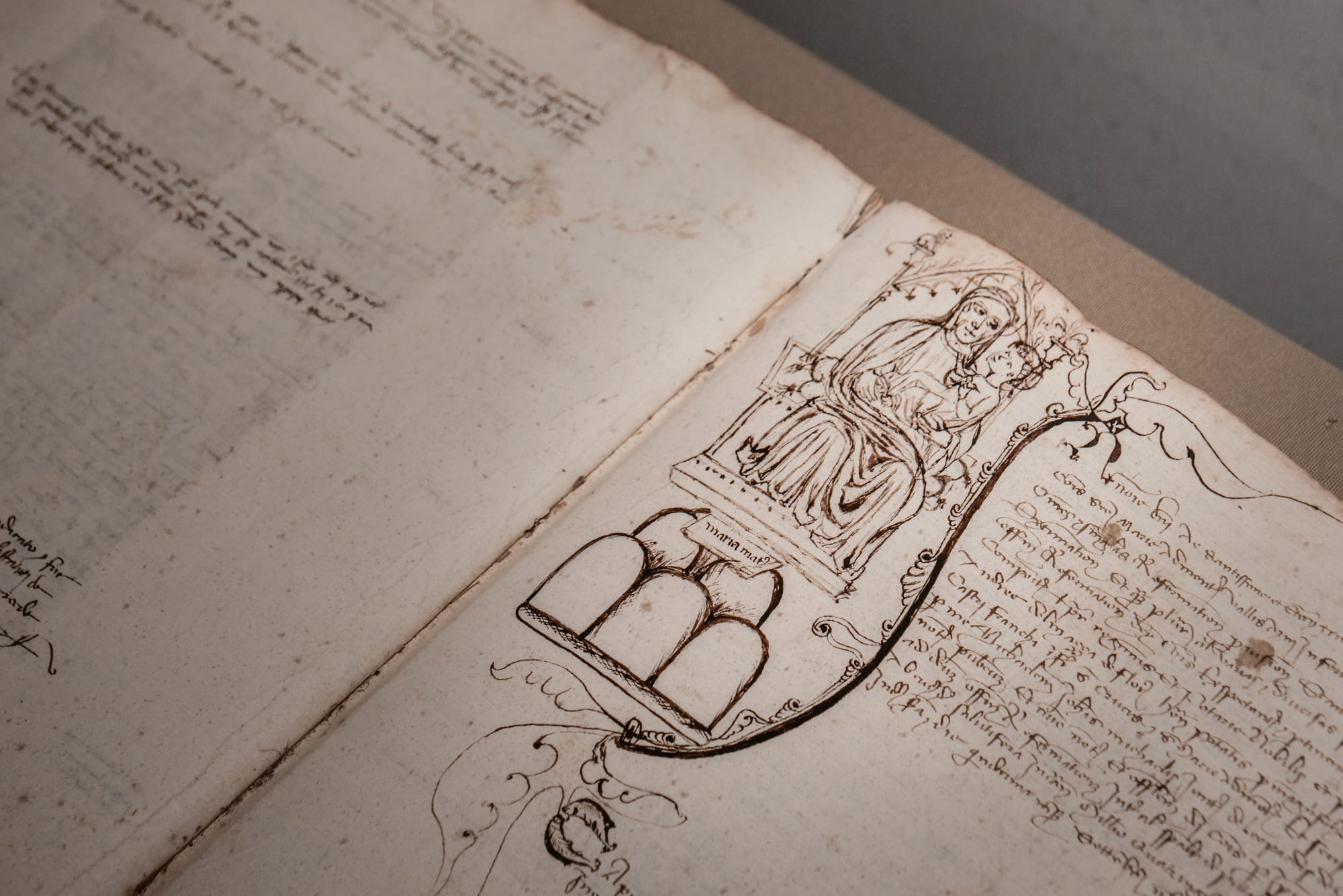 Proseguendo nell’esposizione, la sala lega lo stemma araldico del Comune di Santa Maria a Monte, la Vergine in trono con Bambino, visto sia nella sua versione attuale sia raffigurato in un documento quattrocentesco, alla statua medievale della Madonna col Bambino, scultura in legno dipinto e dorato conservata nella Chiesa Collegiata di Santa Maria a Monte. Evidente infatti risulta essere il rapporto di filiazione tra una delle più preziose e antiche opere d’arte del territorio, datata al 1255, e quello che poi andò a costituire il simbolo civile della comunità. Ulteriore stimolo a visitare la Collegiata è la presenza della copertura lignea del fonte battesimale rinascimentale della chiesa, opera quest’ultima visibile nel dettaglio grazie alla realtà aumentata realizzata in occasione del suo restauro.