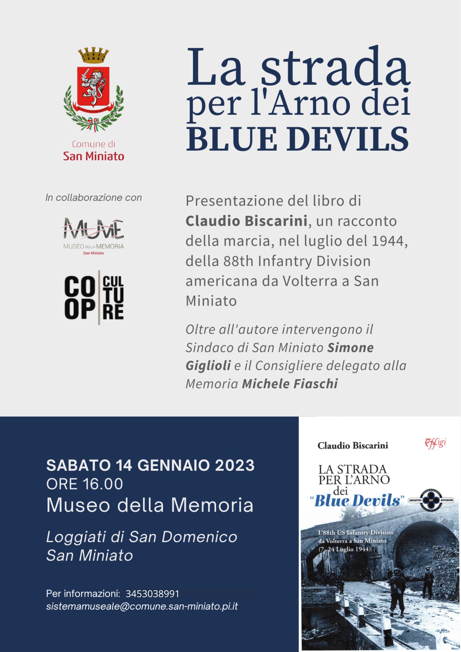 ” LA STRADA PER L’ARNO DEI BLUE DEVILS” Gallery ” LA STRADA PER L’ARNO DEI BLUE DEVILS” News_SanMiniato ” LA STRADA PER L’ARNO DEI BLUE DEVILS” Vi aspettiamo il prossimo 14 gennaio alle ore 16.00 al [...] manolavincenti2023-01-06T11:43:42+01:00Tags: #storiamilitare #storiacontemporanea #memoria, Comune di San Miniato, coopculture, Fondazione San Miniato Promozione|