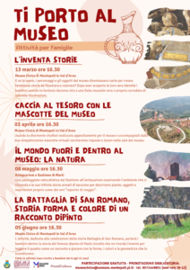 Il Sistema Museale Montopolese ha ideato un calendario di visite e laboratori per bambini e famiglie pensato per scoprire il patrimonio e la storia di Montopoli divertendosi, quattro appuntamenti, una volta al mese.