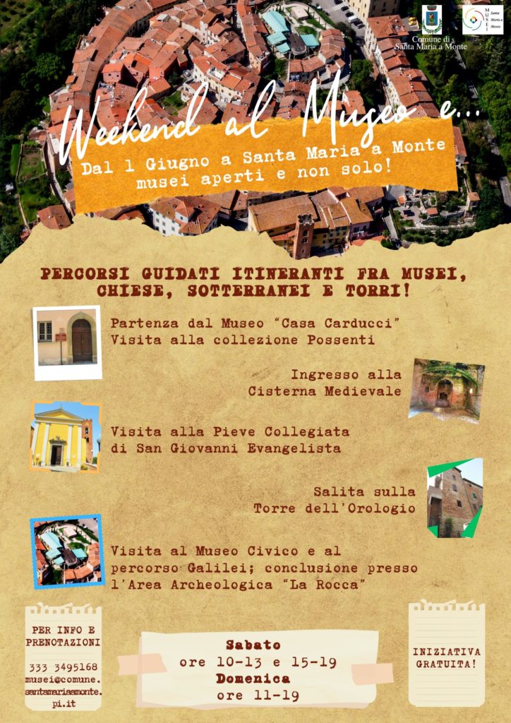 Partendo dal Museo Casa Carducci, che ospita la collezione pittorica permanente di Antonio Possenti ed il carteggio epistolare fra Michele Carducci e il Comune di Santa Maria a Monte, il percorso si articolerà lungo Via Carducci, toccando la Cisterna Medievale con l’annesso sotterraneo, la Chiesa Collegiata con le sue opere medievali come il crocifisso, la Madonna lignea ed il pulpito, e prevedendo anche la salita alla Torre dell’Orologio. L’itinerario terminerà sulla Rocca, con la visita agli scavi dell’Area Archeologica e alle collezioni dell’annesso Museo Civico, con due percorsi dedicati alla Beata Diana Giuntini e all’altro grande concittadino: Vincenzo Galilei, padre dell’illustre Galileo, nato proprio a Santa Maria a Monte nel 1520.